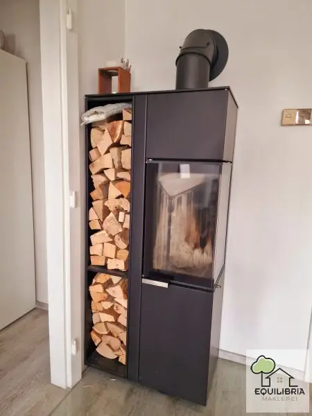 * ein Wohnzimmer mit Schwedenofen und Ausgang zum südlich ausgerichteten Balkon