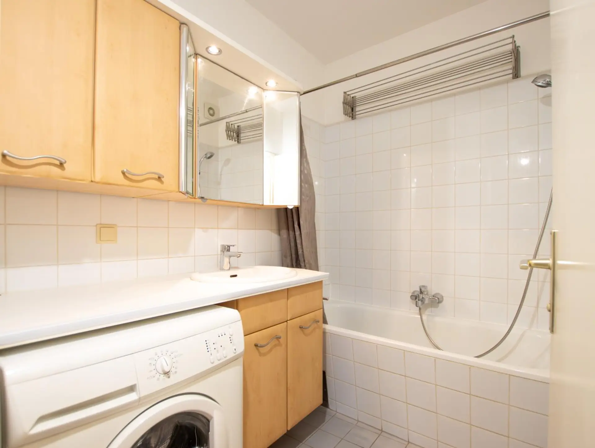Als gemütlicher Rückzugsort dient das Schlafzimmer, das durch eine integrierte Gaube wertvollen zusätzlichen Platz bietet. Ergänzt wird das Raumangebot durch ein komplettes Badezimmer mit Badewanne und Waschmaschinenanschluss, sowie ein separates WC in funktionaler Grundausstattung. Für maximalen Komfort im Alltag sorgt der eigene PKW-Garagenstellplatz, der trotz der zentralen Lage ein völlig unbeschwertes Ankommen in Ihrem neuen Zuhause ermöglicht.