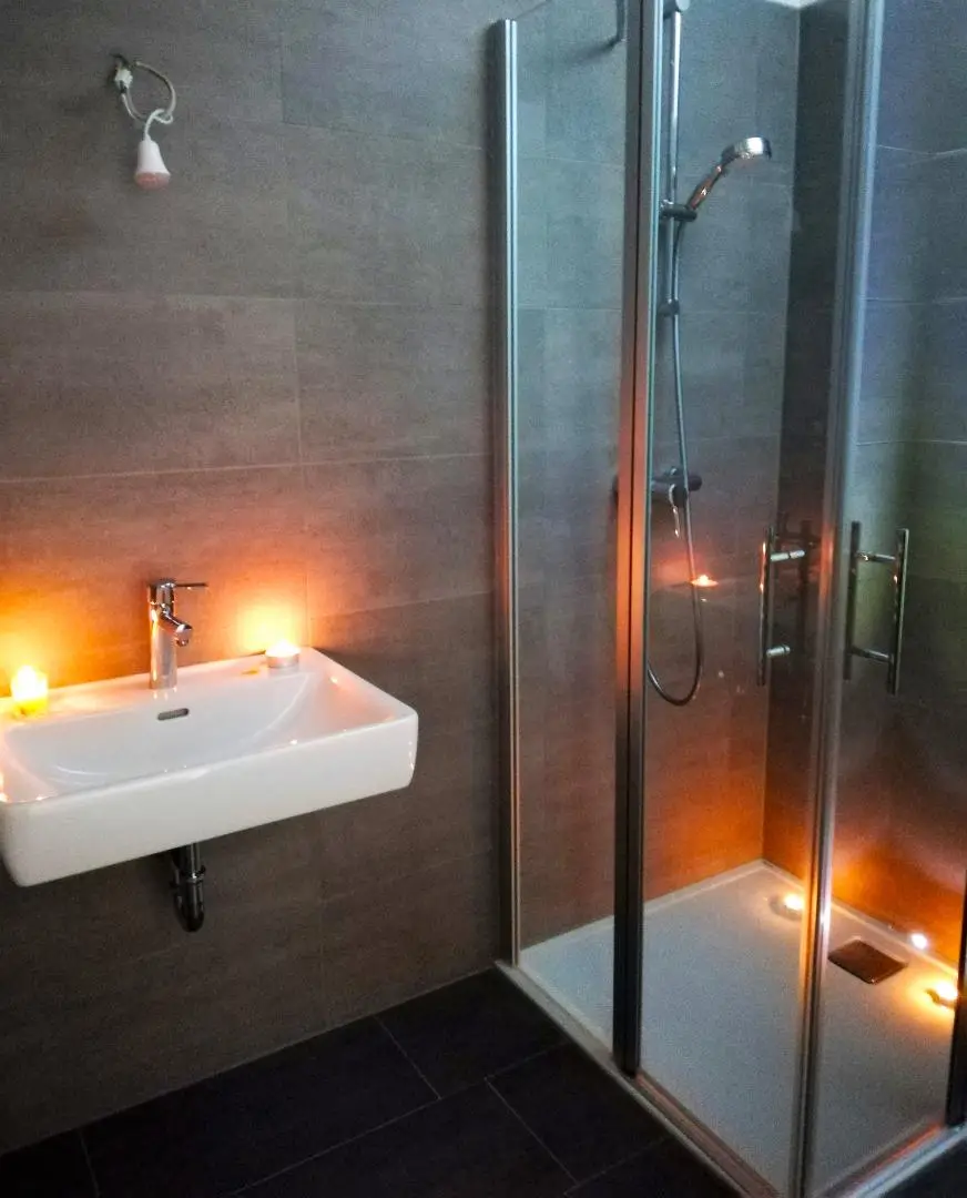 - Duschkabine, Handtuchtrockner, Heizkörper, Waschbecken und WC