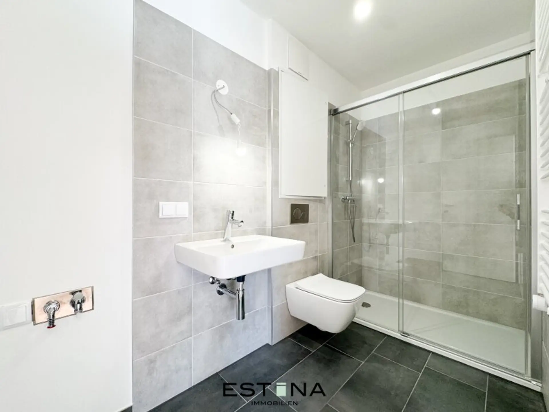 - Badezimmer mit Dusche, Waschbecken, Toilette und Waschmaschinenanschluss