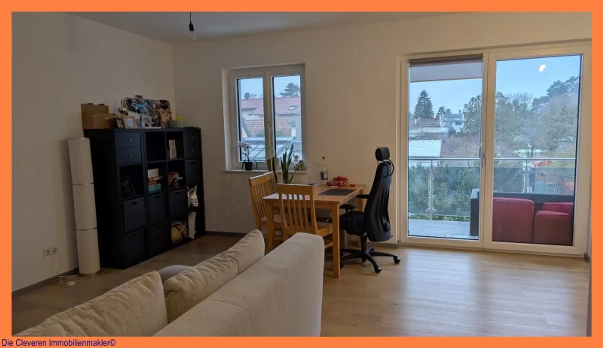 Die offene Wohnraumküche bietet genug Raum für einen Esstisch und einen gemütlichen Wohnzimmerteil. Außerdem gelangen Sie von dort auf einen Balkon, welcher zusätzlichen Platz für schöne Abende oder Frühstücke bietet.