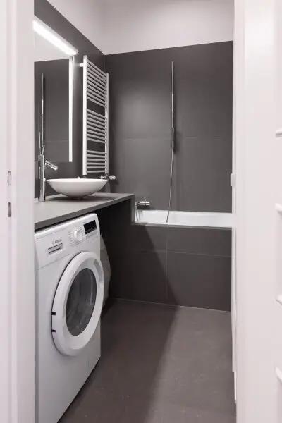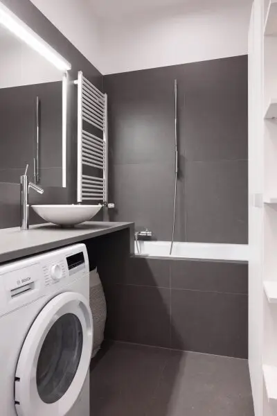 Badezimmer mit Badewanne und Anschluss für Waschmaschine