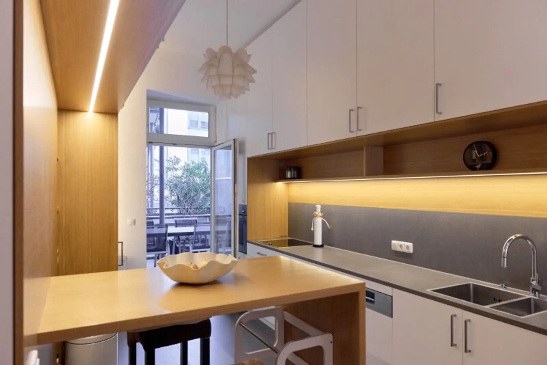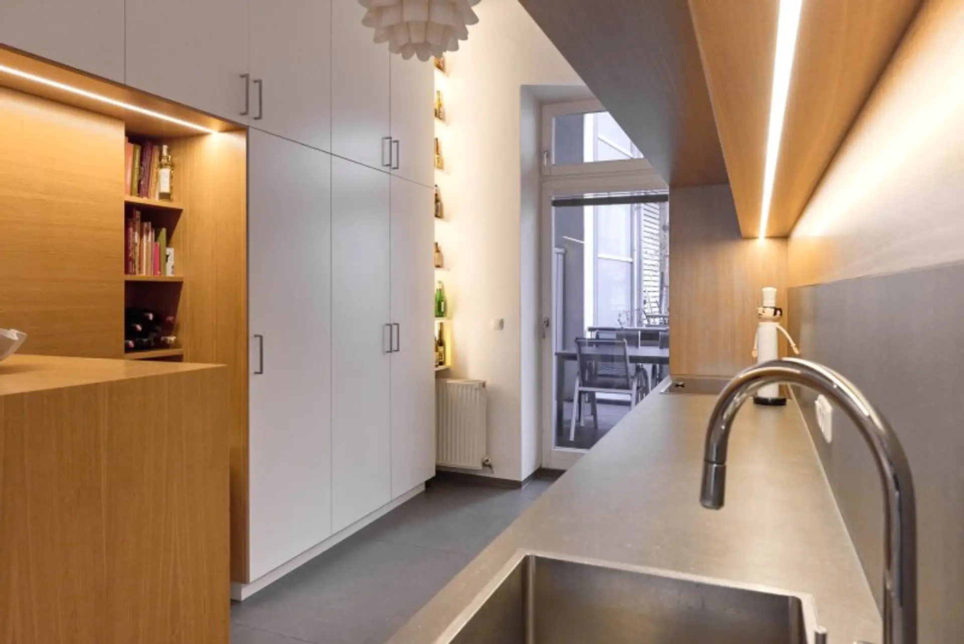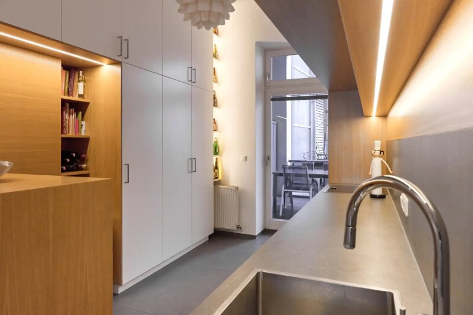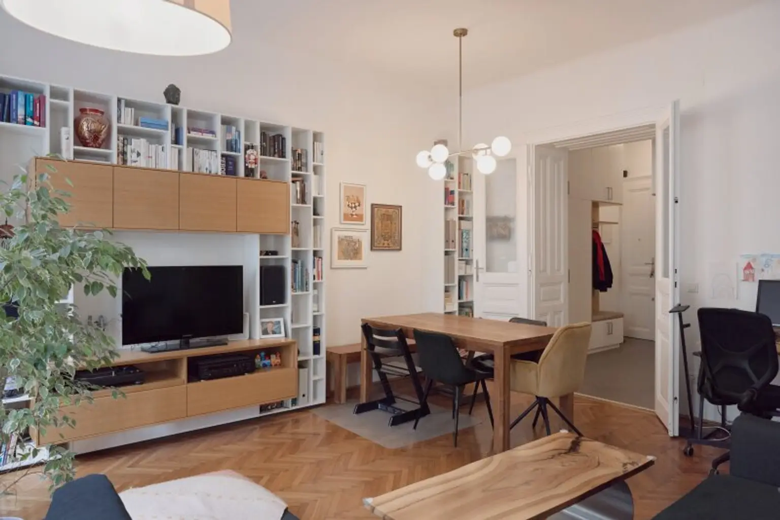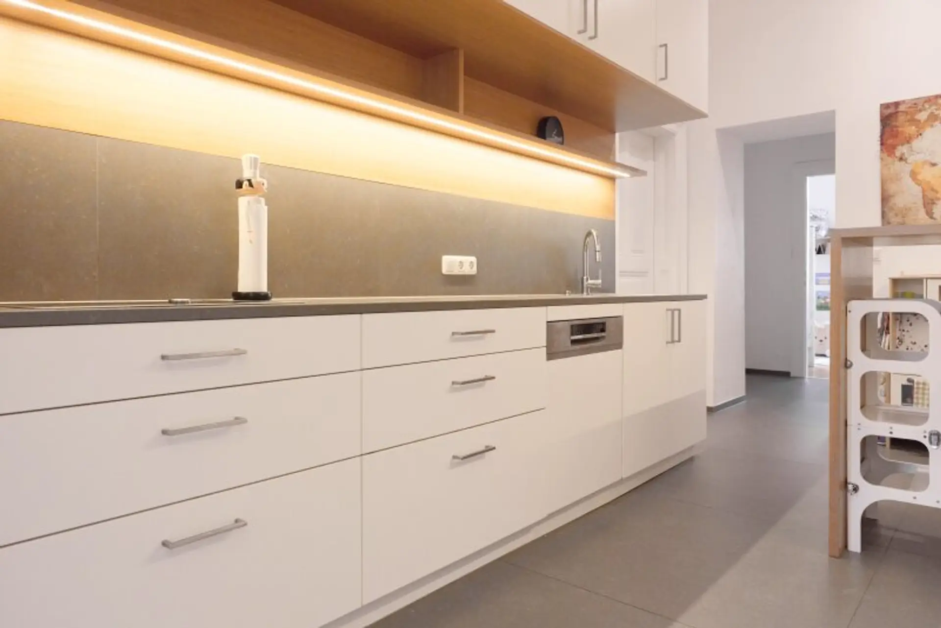 Die maßgefertigte Tischlerküche überzeugt mit hochwertiger Ausstattung, durchdachtem Stauraum und einem einladenden Bartisch – ideal für geselliges Kochen und Verweilen. Auch das Vorzimmer kann mit Tischlereinbauten aufwarten.