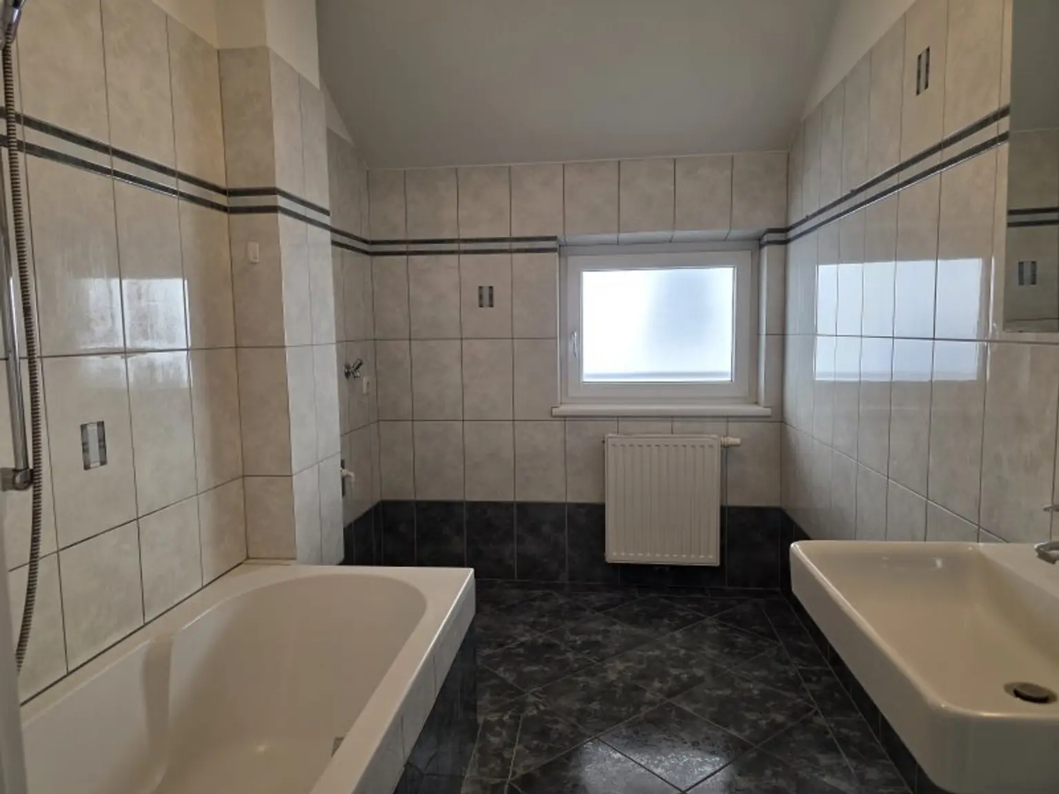 -ein geräumiges Badzimmer mit Badewanne und Waschmaschinenanschluss und Fenster,