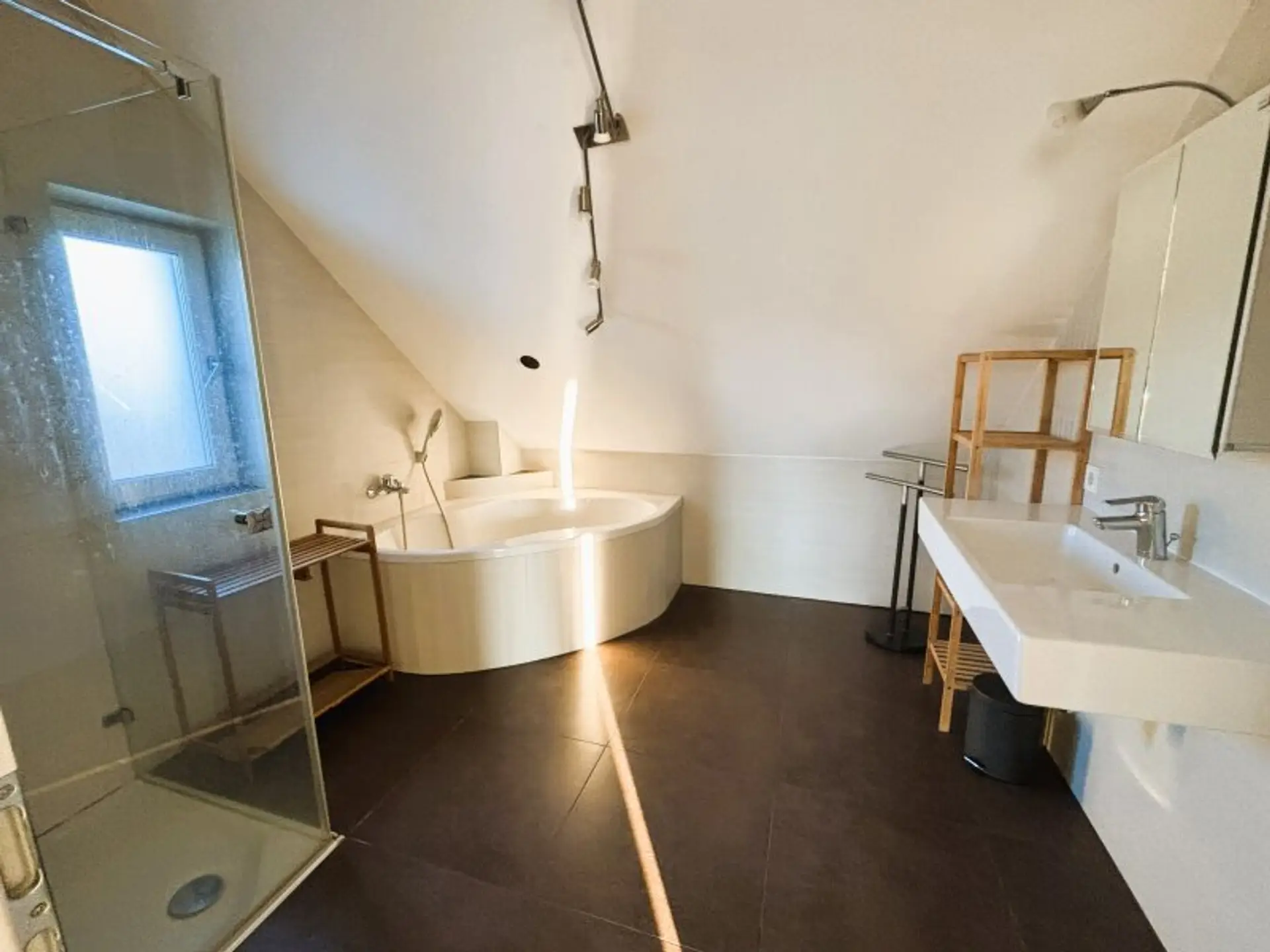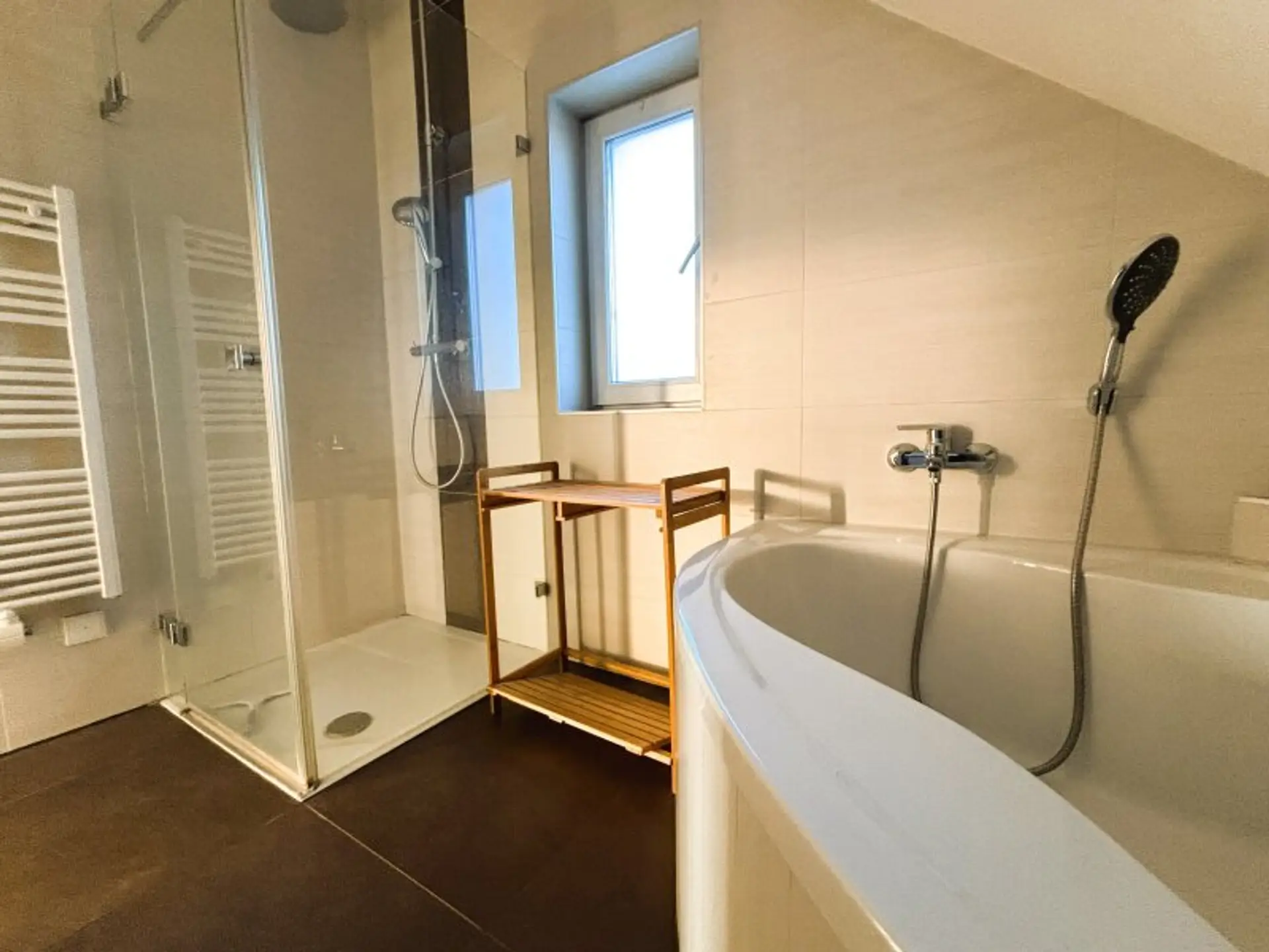 * Helles Badezimmer mit Tageslicht, Dusche und Eckbadewanne