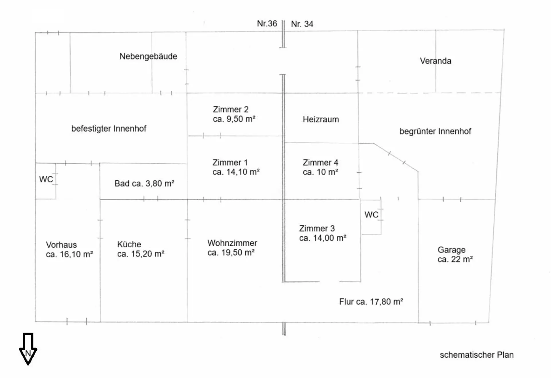 Vom Vorhaus gelangt man ebenso über einen ostseitigen, gepflasterten Innenhof mit ca. 31 m², in die zahlreichen Lagerräume des großzügigen Nebengebäudes mit ca. 80 m². Dieses umfasst westseitig auch eine überdachte Veranda von welcher man die Stille des zweiten, begrünten Innenhofes mit ca. 25 m² genießen kann. Von hier gibt es auch einen Zugang zum Wohnbereich sowie zum Heizraum und zur Garage.