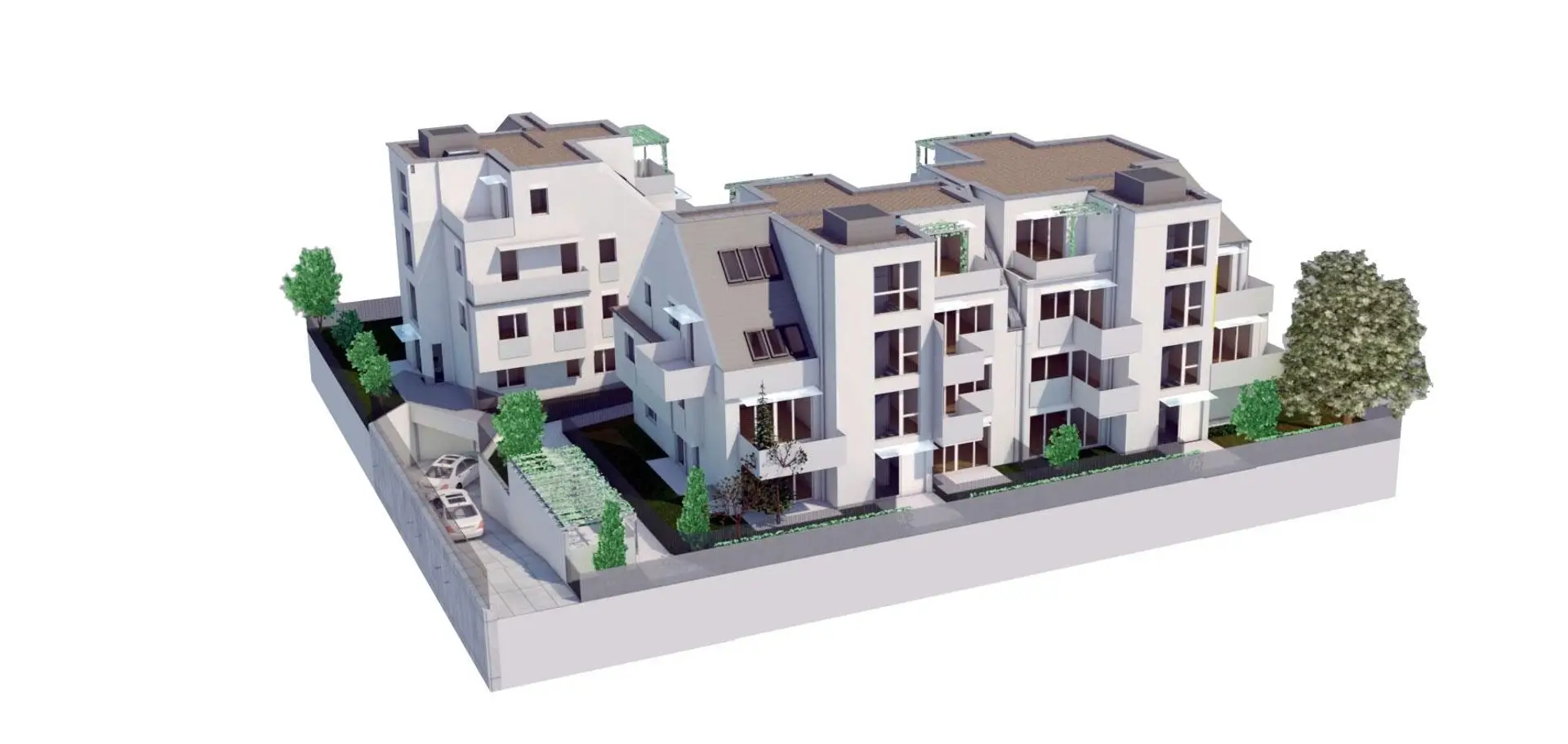 Die Grundstücke liegen in einem kleinstrukturierten und ruhigen Kleingarten-Siedlungsgebiet. Es werden drei neue Mehrfamilienhäuser - zwei gekuppelte entlang.