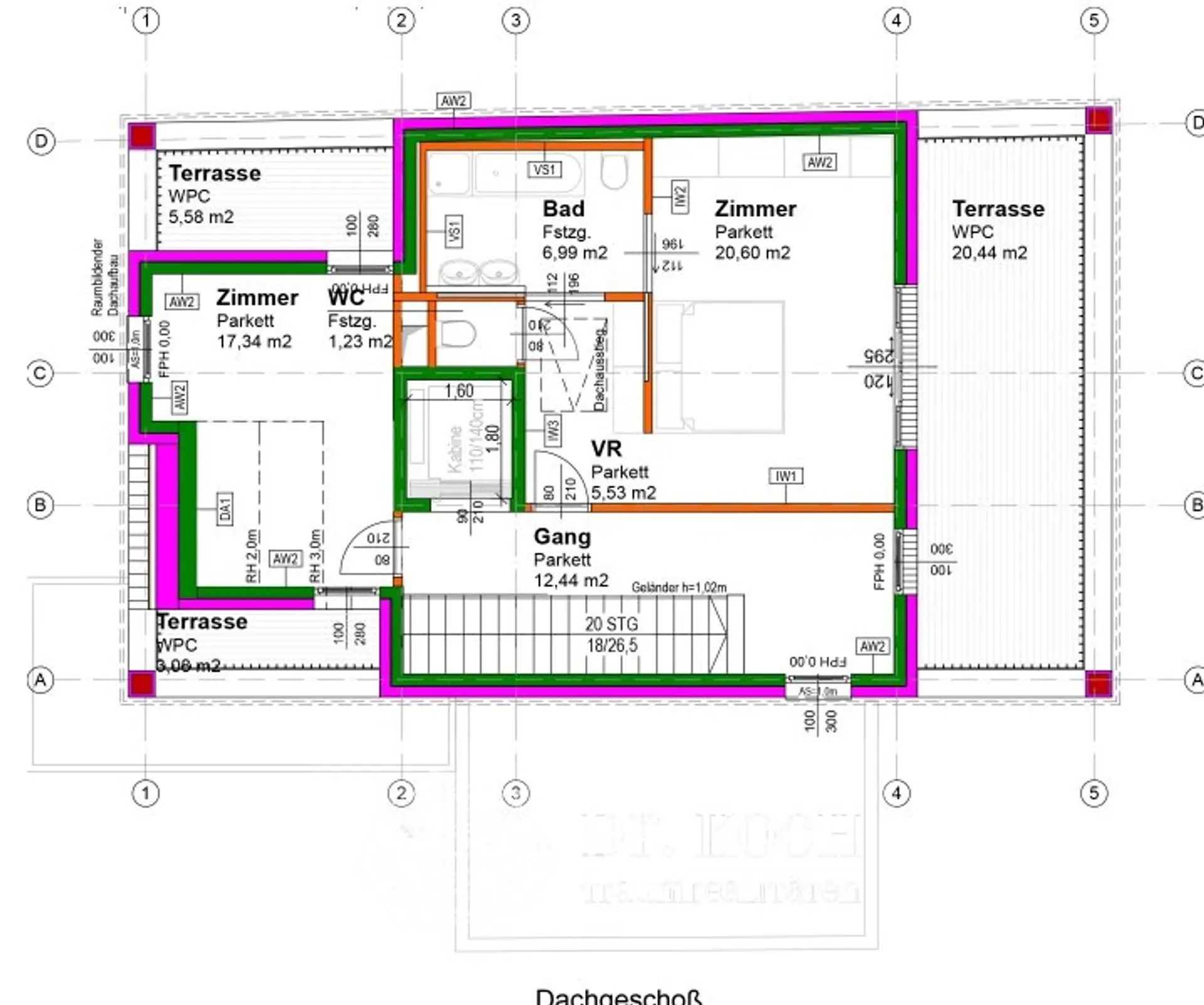 EG: Vorzimmer, Wohnzimmer mit offener Küche und Ausgang auf eine Terrasse, Arbeitszimmer, WC