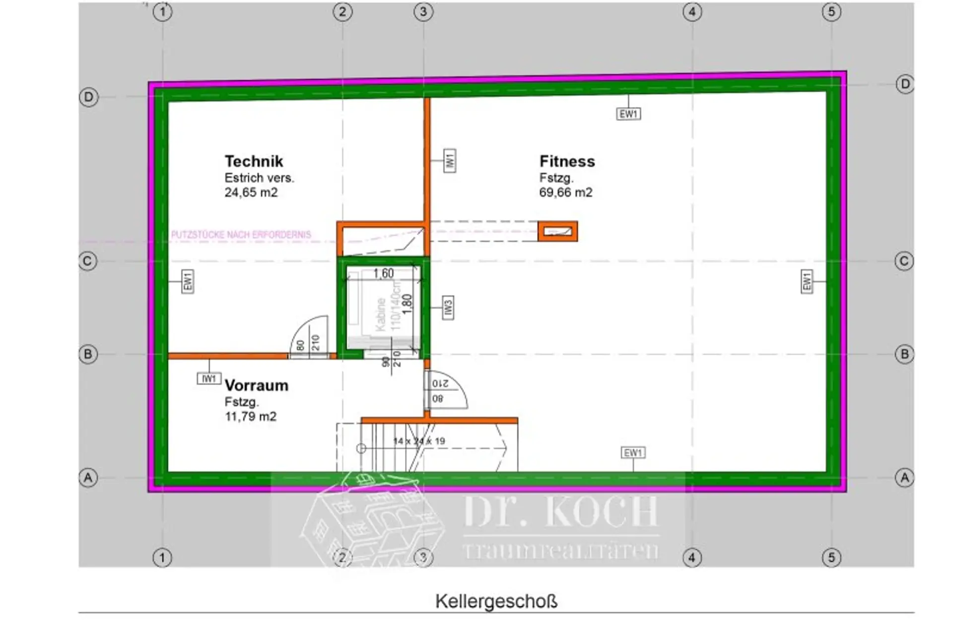 Im Keller ist neben der Technik ein großer Raum für Fitness, etc. geplant. Ein Garagenplatz.