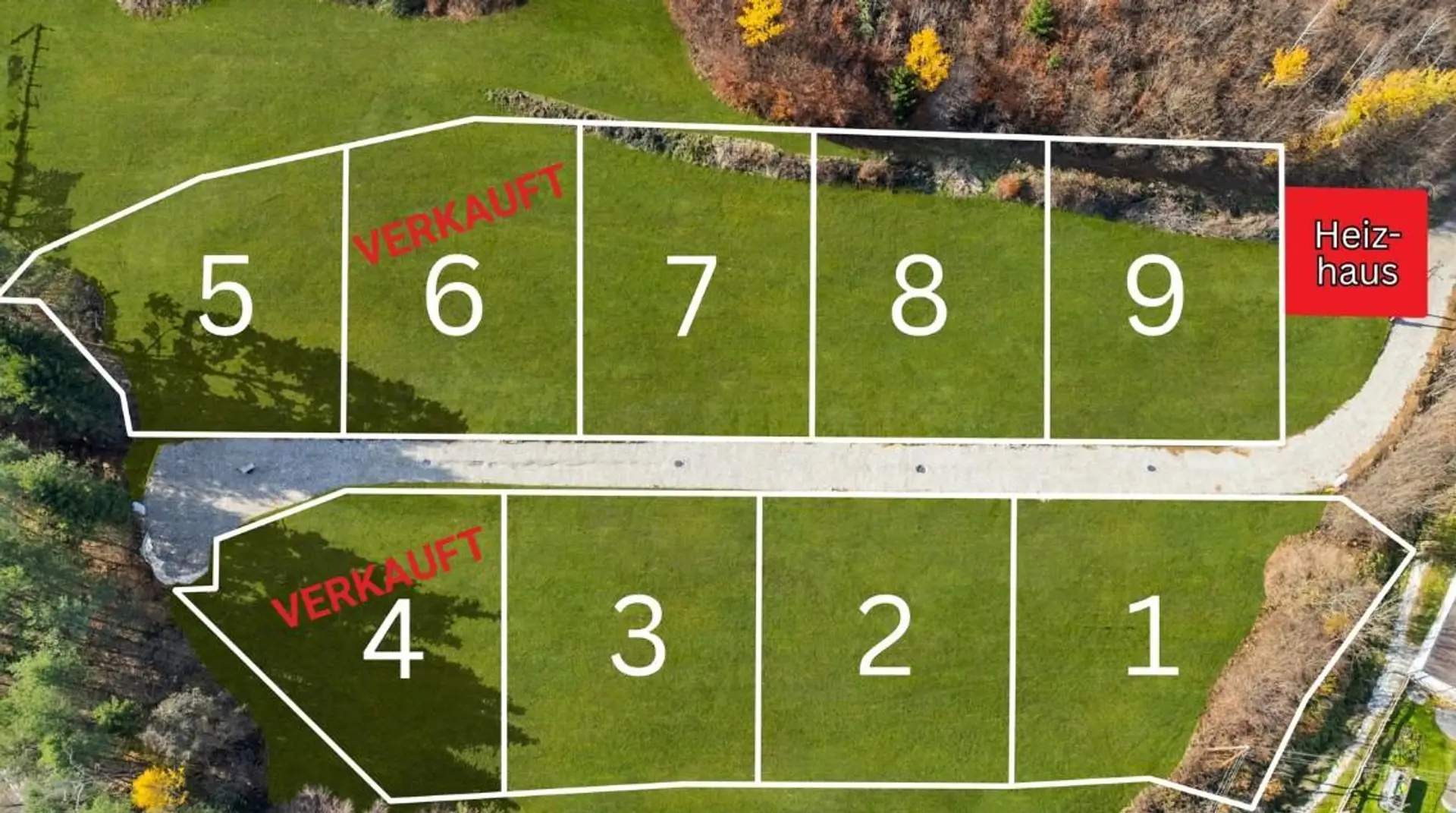 Die Zufahrt ist anteilsmäßig bei den einzelnen Grundstücken inkludiert. Insgesamt sind noch 7 Baugrundstücke in der Größe von 690 m² bis 958 m² verfügbar.