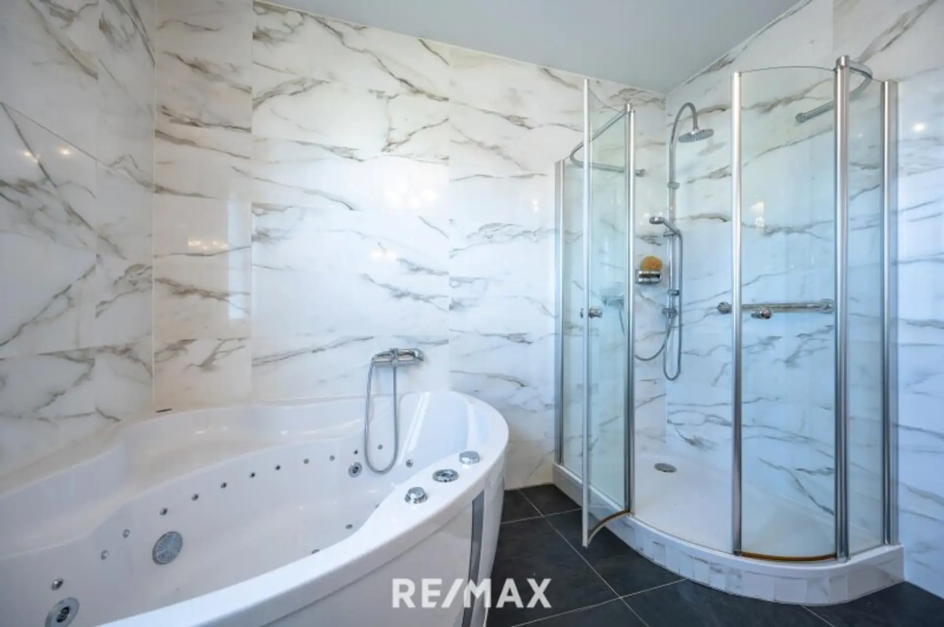 - ein Badezimmer mit Wanne, Dusche und Fenster,