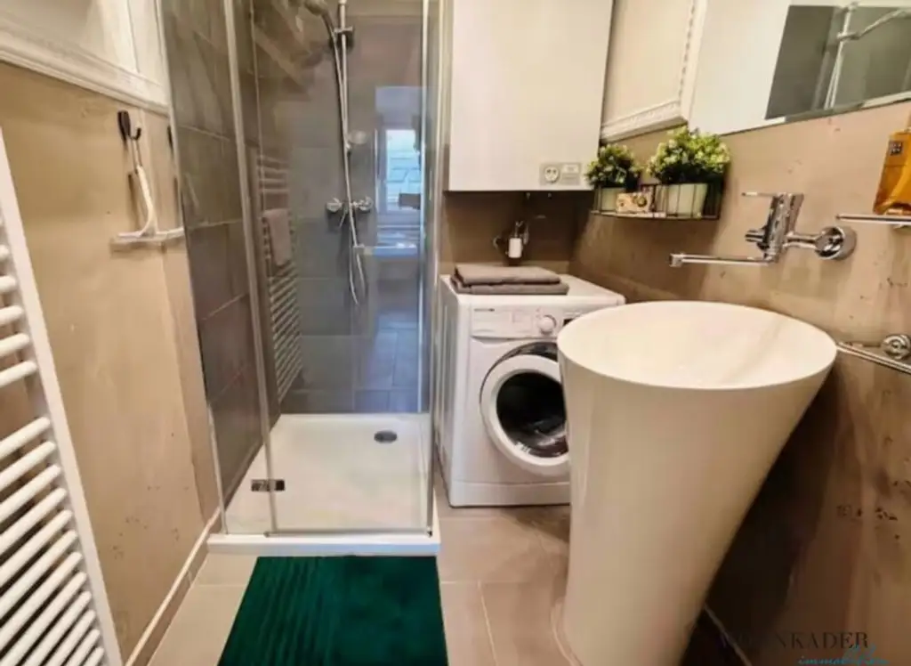 Modernes Badezimmer mit Dusche, Waschbecken und Waschmaschine