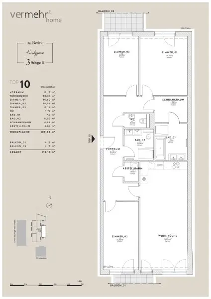Aufgeteilt auf 4 Zimmer befinden sich auf ca 110m² Wohnfläche insgesamt 1 Vorzimmer, 1 Toilette, 1 Abstellraum, 1 Wohnzimmer mit offener Wohnküche und angrenzendem 4m² Balkon, sowie 3 Schlafzimmer, ein weiterer 4m² Balkon, 2 Badezimmer und ein Schrankraum.