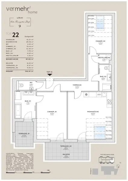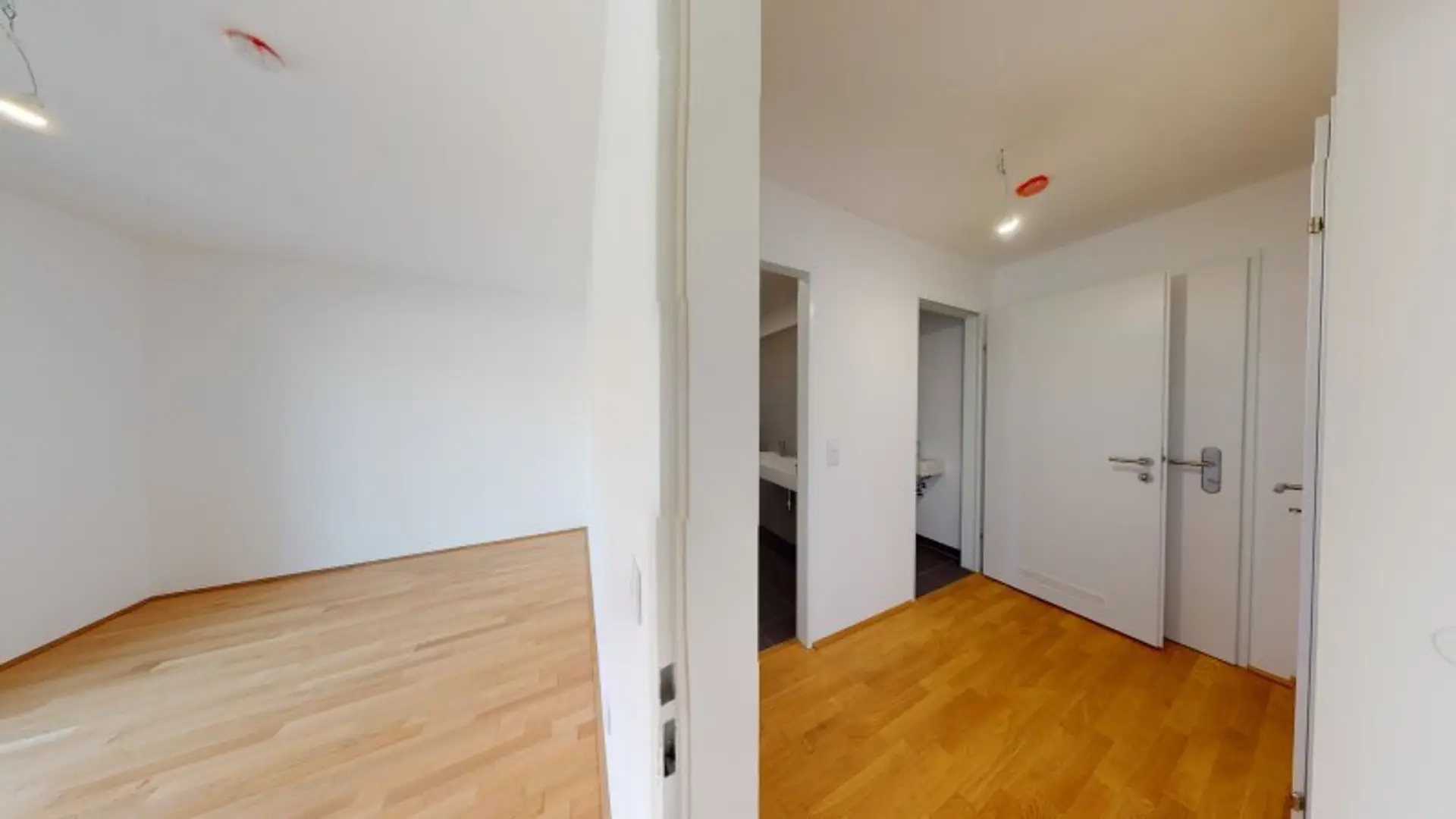 Aufgeteilt auf 3 Zimmer befinden sich auf ca 87m² Wohnfläche insgesamt 1 Vorzimmer, 1 Toilette, 2 Badezimmer, 1 Abstellraum, 1 Wohnzimmer mit offener Wohnküche und 1 angrenzender Terrasse mit 10m², sowie 2 Schlafzimmer, eines davon mit Ausgang auf ebendiese 10m² große Terrasse, sowie eine 6m² Terrasse erreichbar über das zweite Badezimmer.
