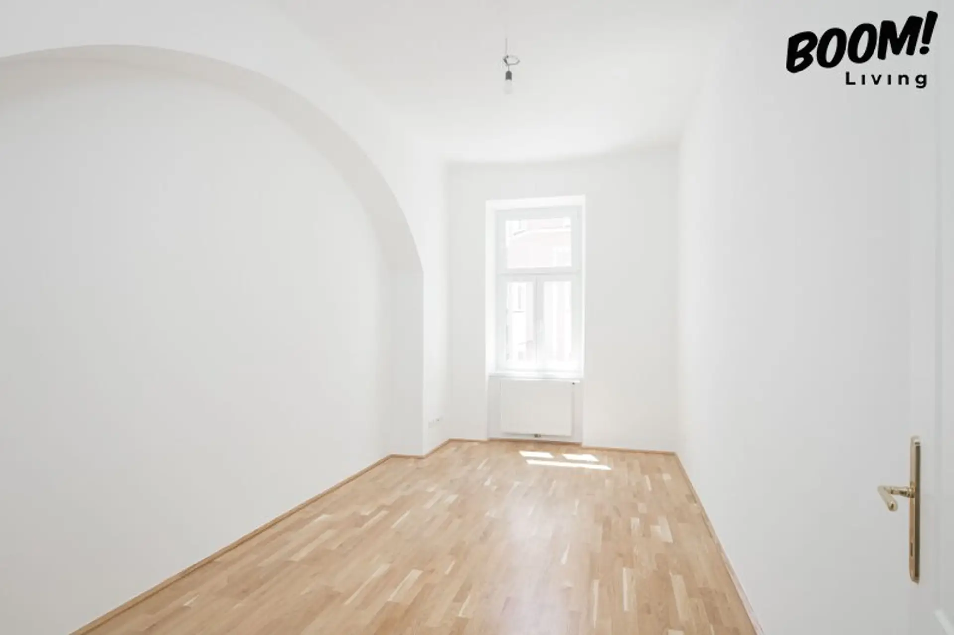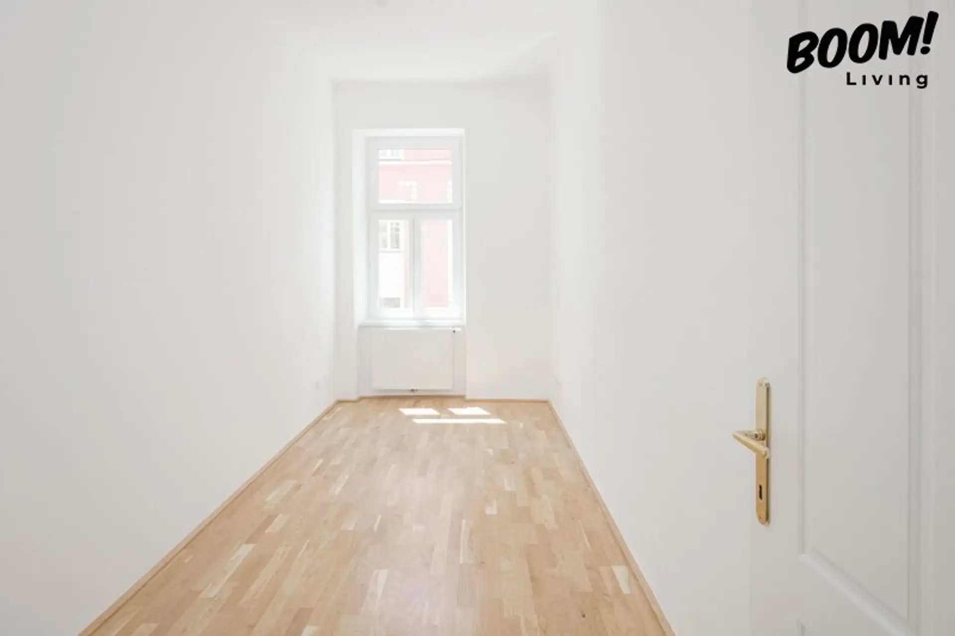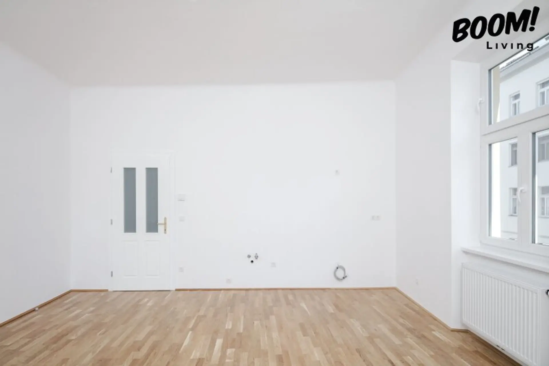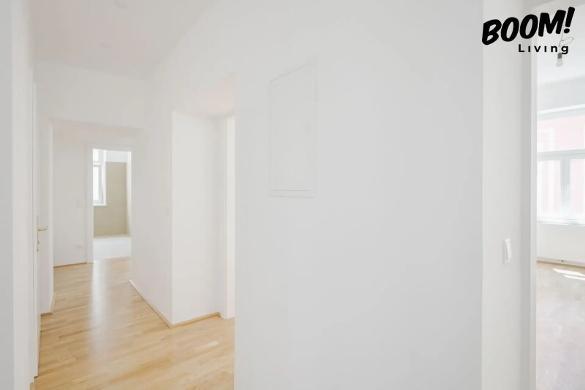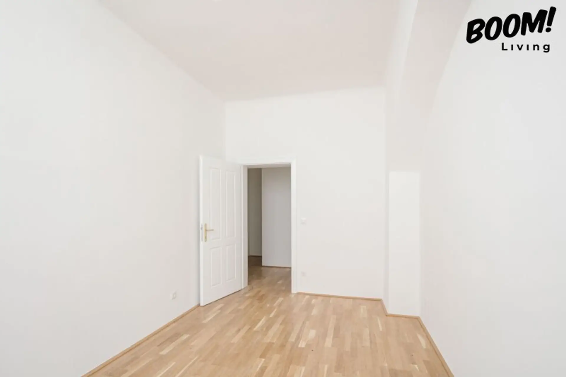 In den Wohn- und Schlafräumen wurde eine elegante Eichen-Landhausdiele (geklebt) verlegt, die gemeinsam mit den weißen Alt-Wien-Innentüren mit Kassettenoptik den klassischen Charakter des Altbaus mit modernem Wohnkomfort verbindet.