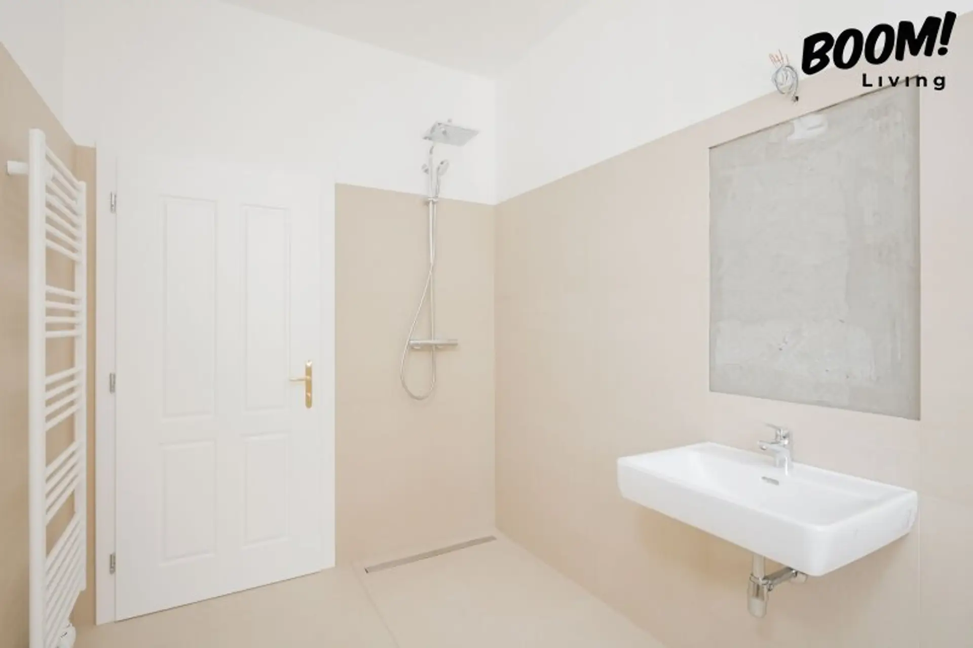 Das Badezimmer (ca. 6,89 m²) ist modern ausgeführt und türhoch mit großformatigen Steinzeugfliesen (60 × 60 cm) in zeitlosen Grautönen verfliest. Es verfügt über eine hochwertige Sanitärausstattung, darunter ein modernes Waschbecken, Markenarmaturen von Grohe sowie eine Dusche mit Glasabtrennung. Das separate WC (ca. 1,80 m²)ist ebenfalls hochwertig ausgestattet.