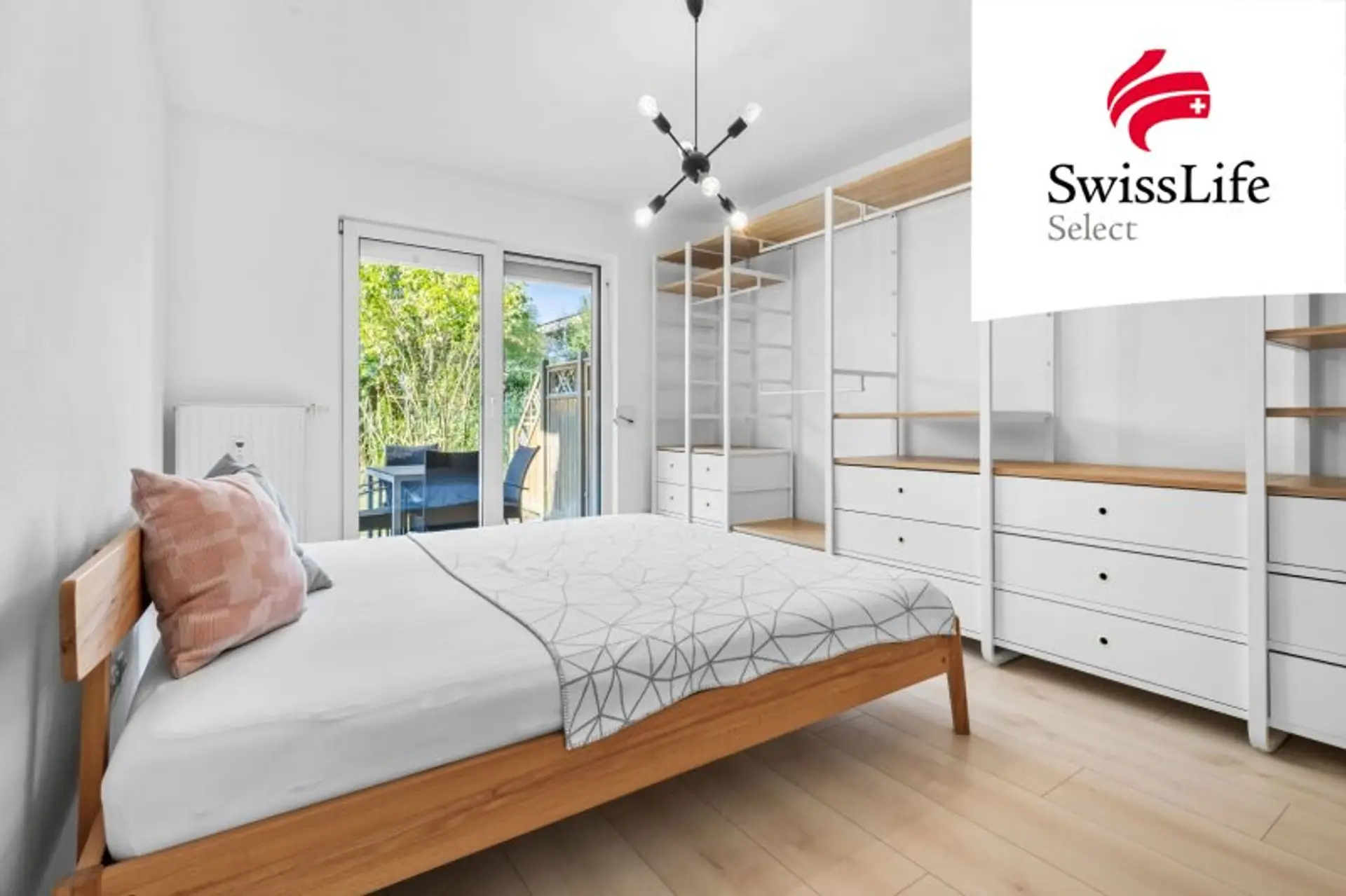 Das Schlafzimmer zeichnet sich durch seine Helligkeit und großzügige Raumgestaltung aus. Ein großes Bodentiefes Fenster ermöglicht Ihnen einen direkten Zugang zum Garten und füllt den Raum mit natürlichem Licht.
