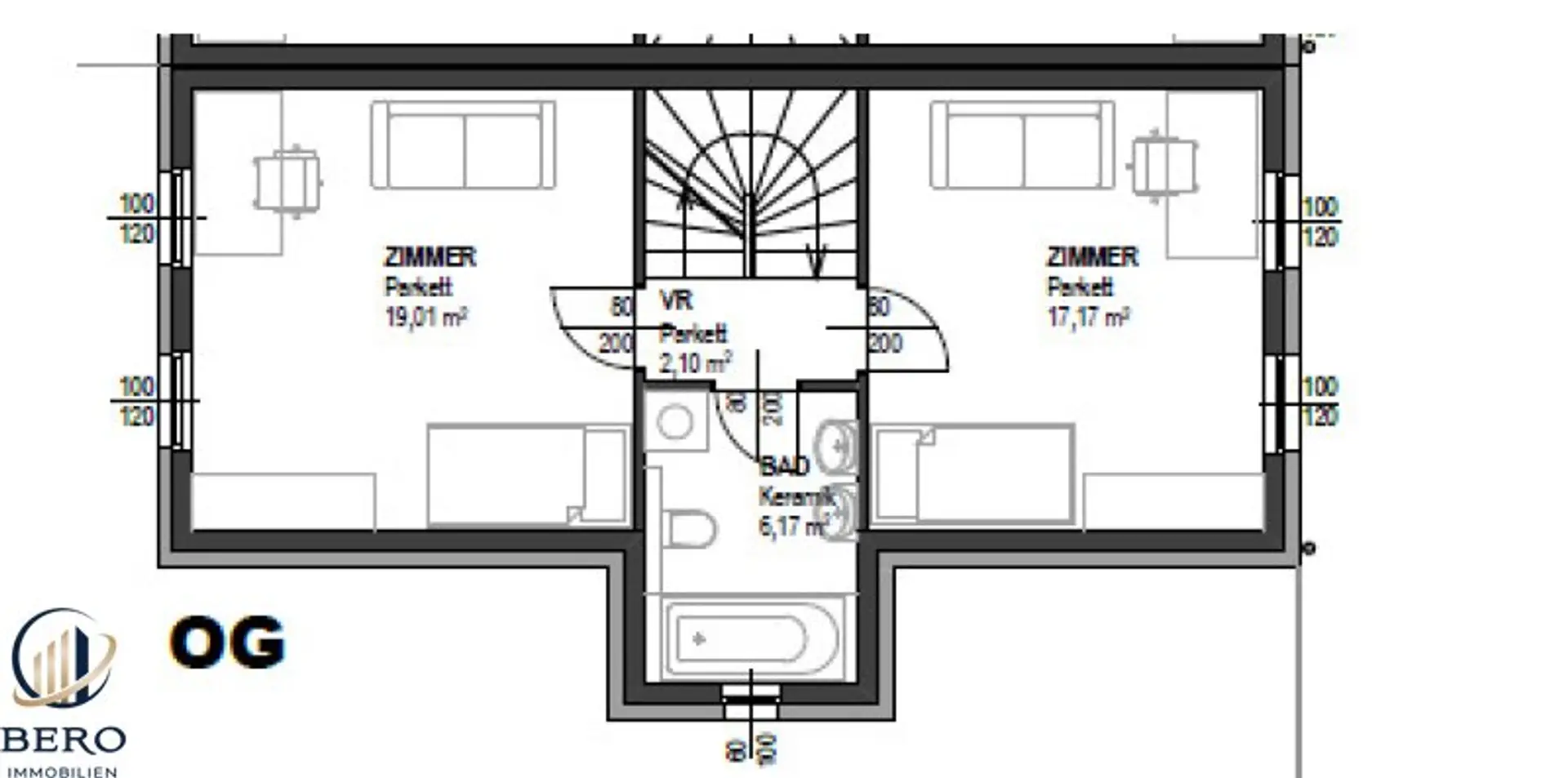 Über die Treppe gelangen Sie auf die zweite Ebene der Immobilie. Die beiden großen Schlafräumlichkeiten sind zentral begehbar und verfügen ihrerseits über ausreichend Stauraum, für Ihre Garderobe. Das Tageslicht-Bad ist mit einer Badewanne, einem Doppelwaschbecken und einer Toilette ausgestattet.