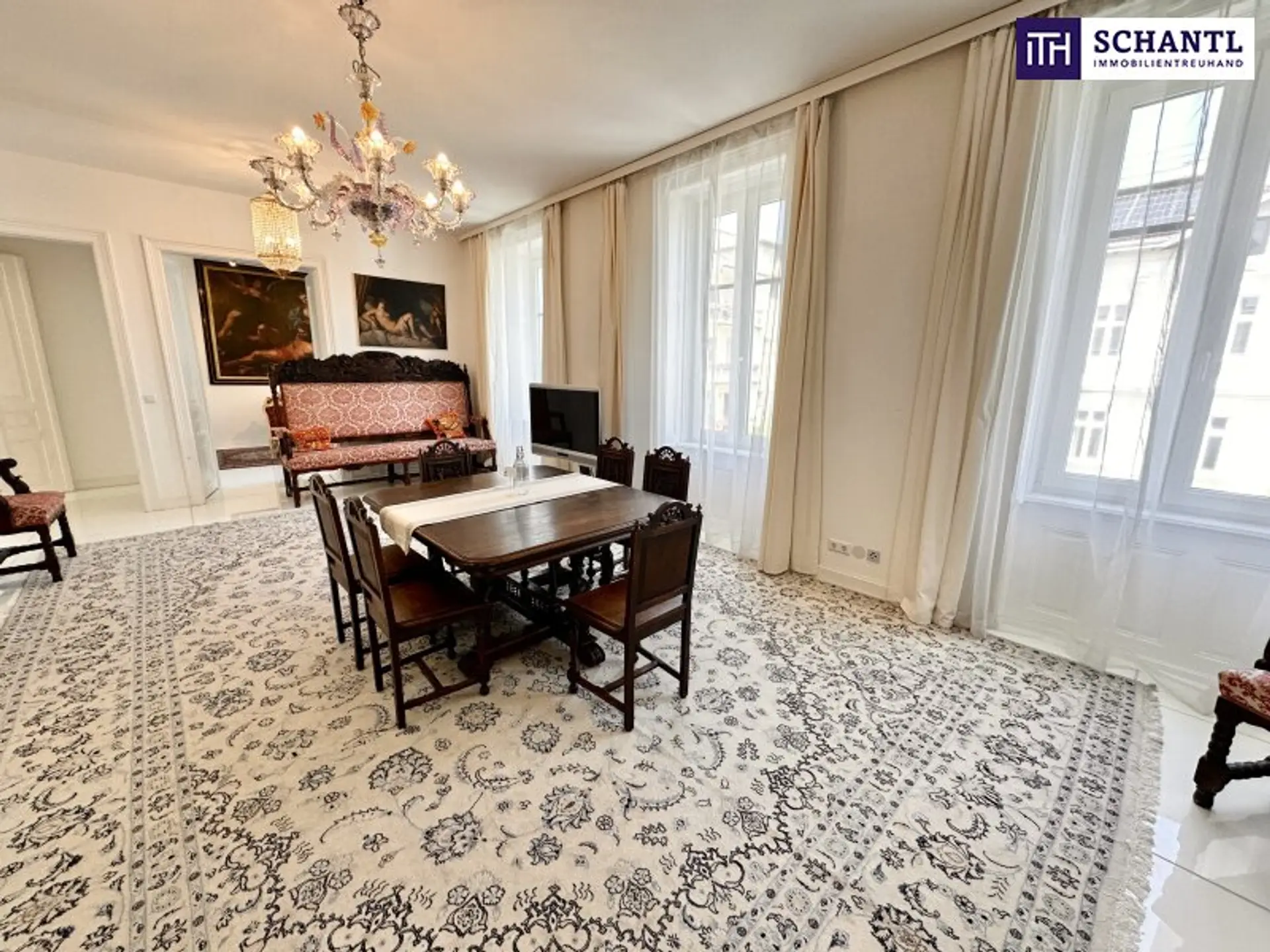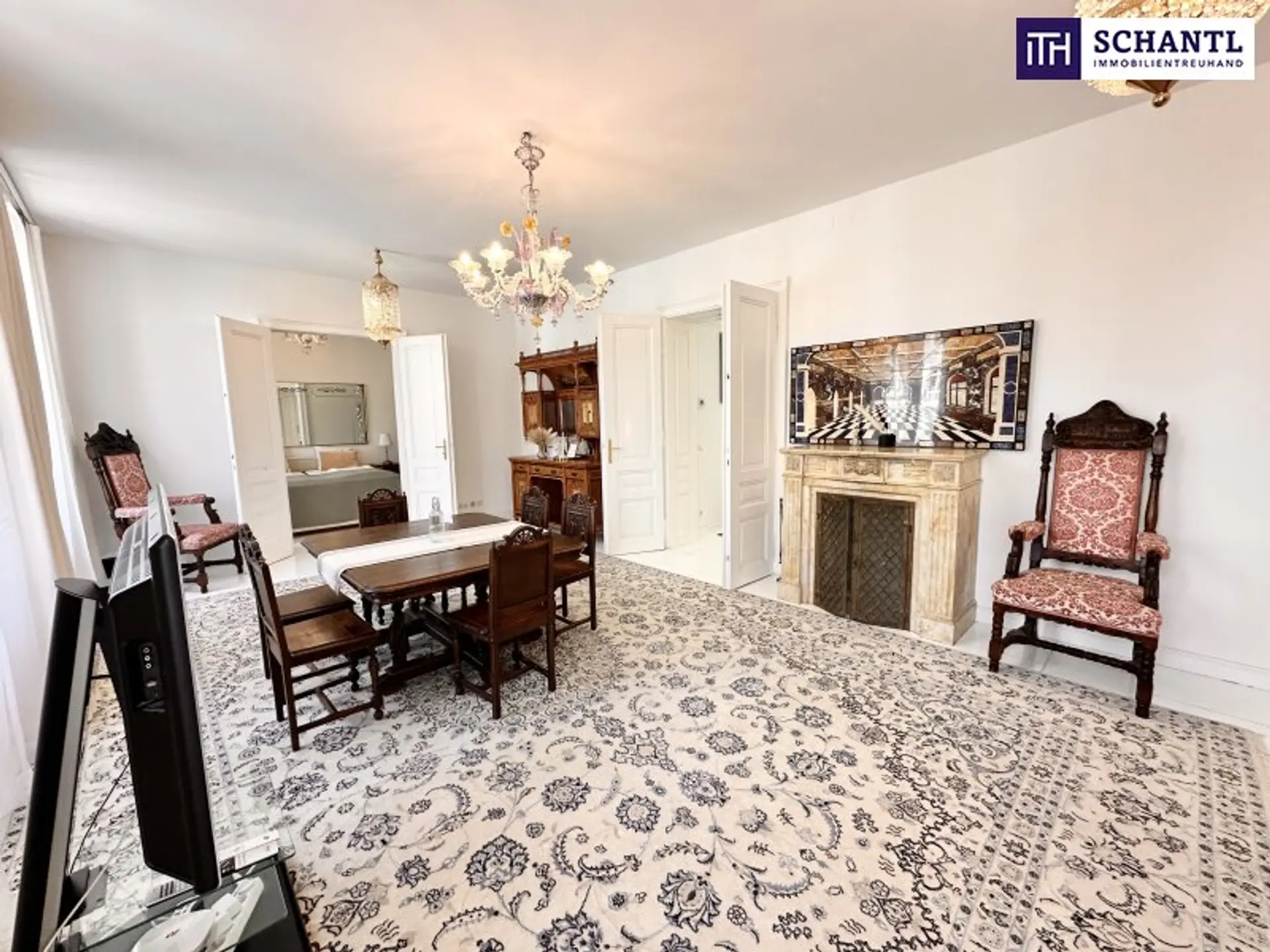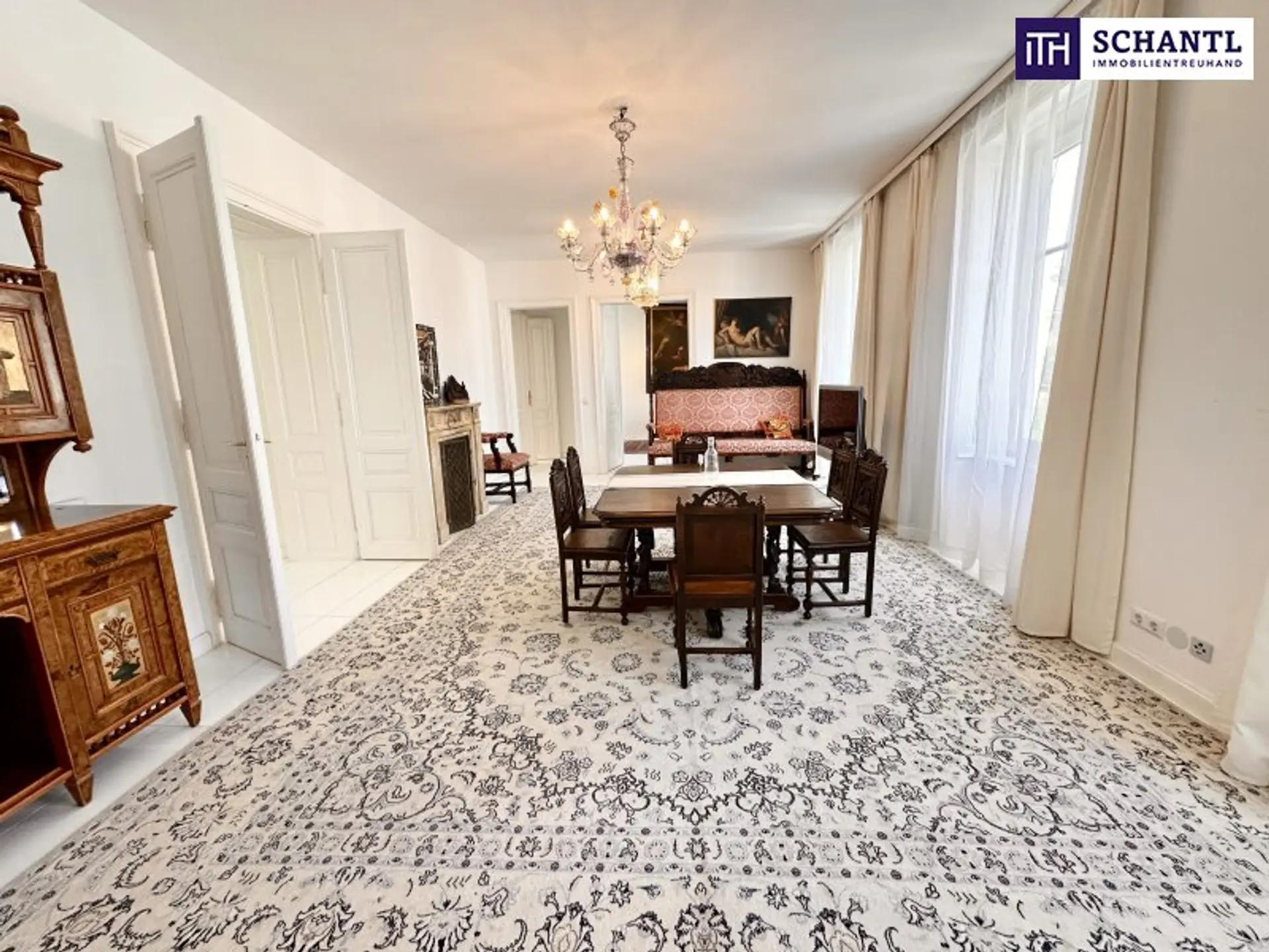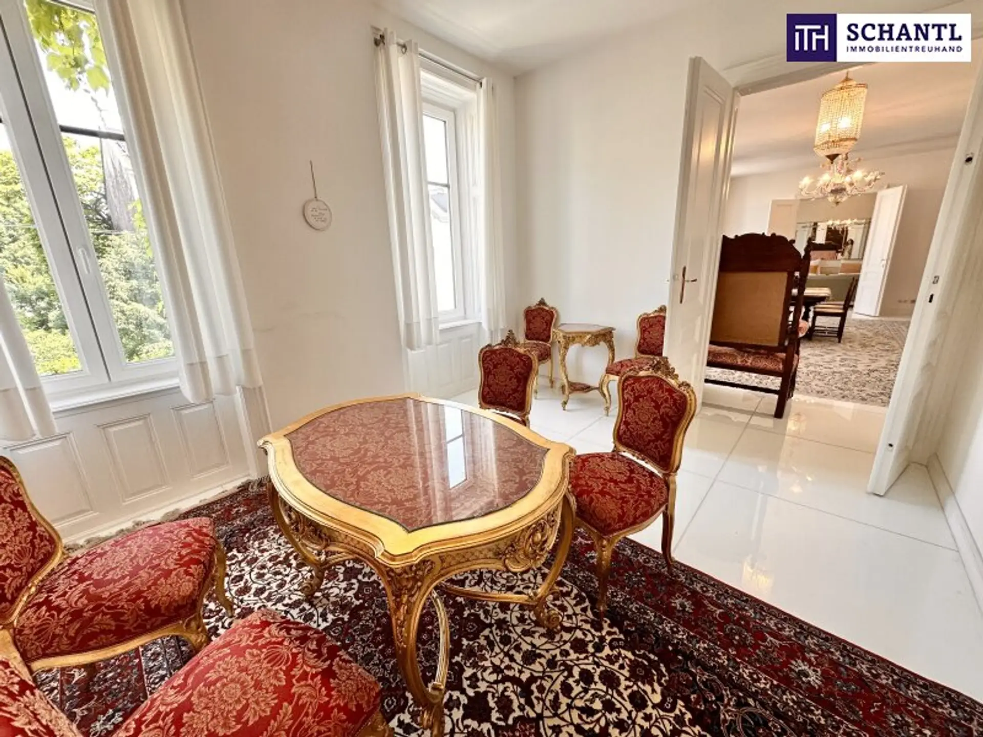 Bereits beim Betreten der Wohnung wird der besondere Charakter spürbar: kunstvolle Stuckdecken, elegante Kristallluster und hochwertiges Echtholzparkett verleihen den Räumen eine zeitlose, repräsentative Ausstrahlung. Die Wohnung verfügt über insgesamt vier Zimmer, zwei Badezimmer, einen Schrankraum sowie eine separate Küche und bietet damit viel Platz für anspruchsvolles Wohnen auf hohem Niveau.