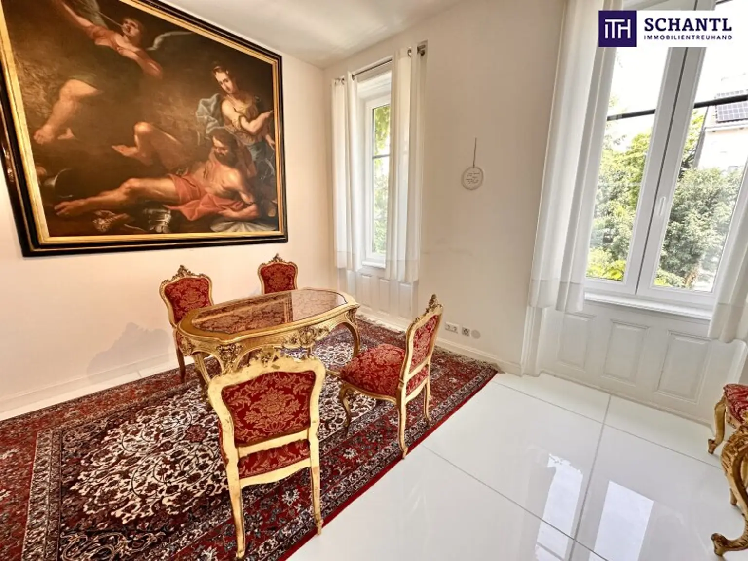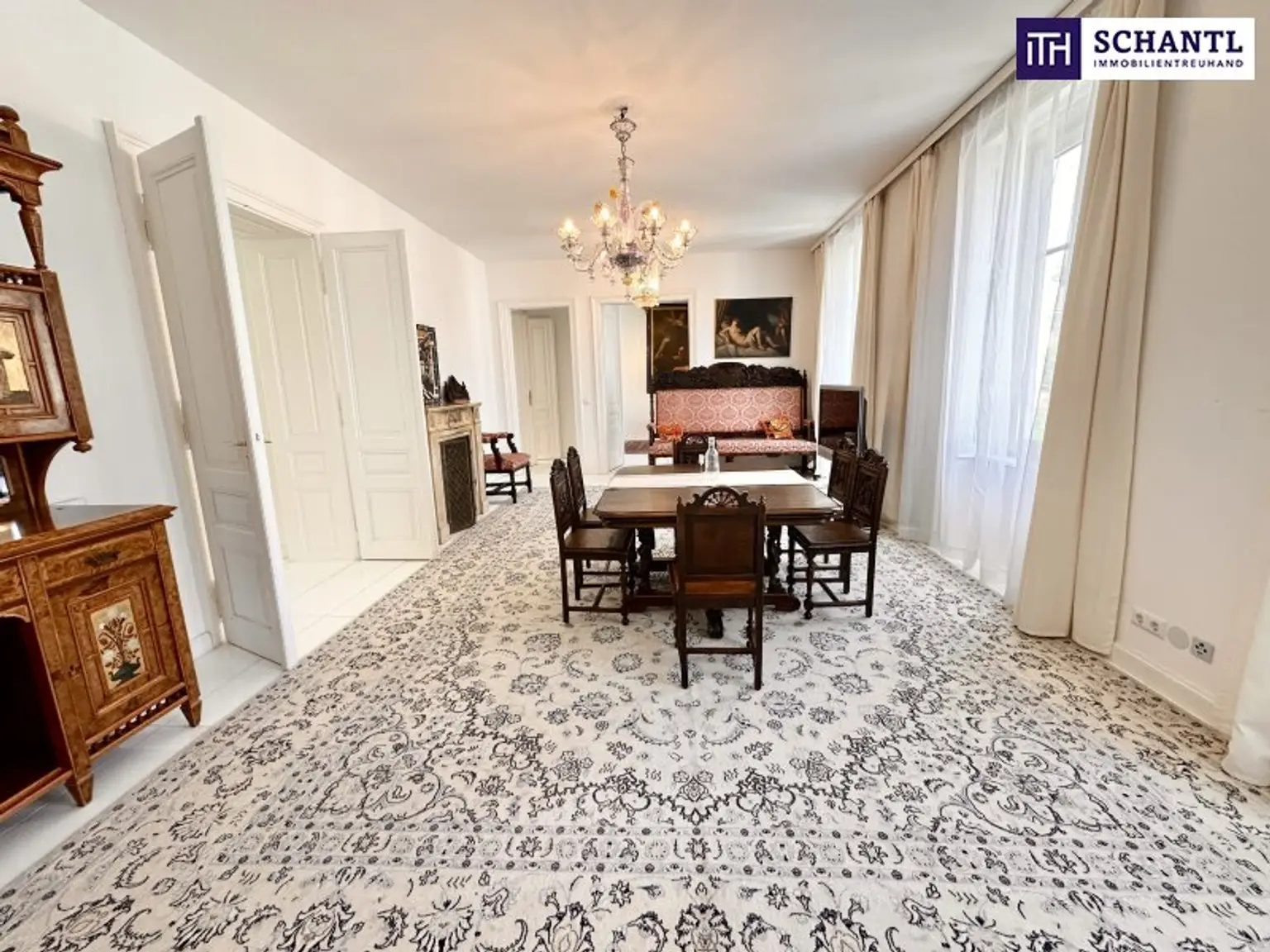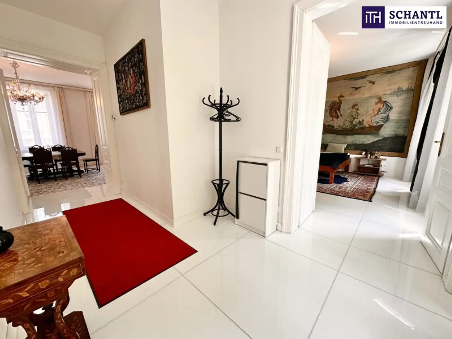 Bereits beim Betreten der Wohnung wird der besondere Charakter spürbar: kunstvolle Stuckdecken, elegante Kristallluster und hochwertiges Echtholzparkett verleihen den Räumen eine zeitlose, repräsentative Ausstrahlung. Die Wohnung verfügt über insgesamt vier Zimmer, zwei Badezimmer, einen Schrankraum sowie eine separate Küche und bietet damit viel Platz für anspruchsvolles Wohnen auf hohem Niveau.