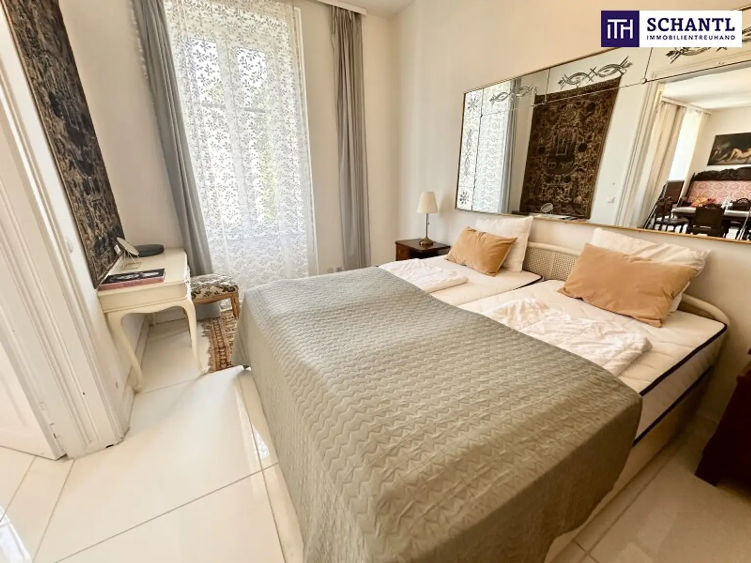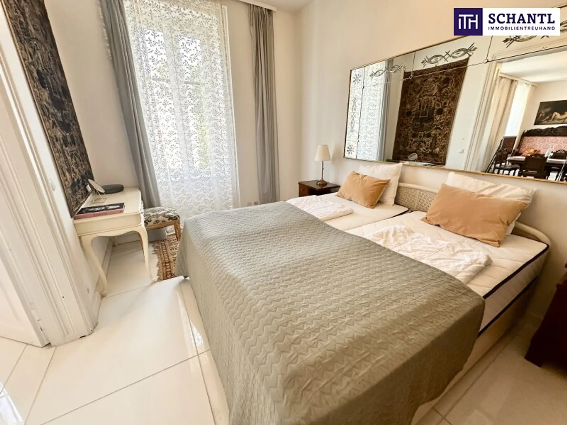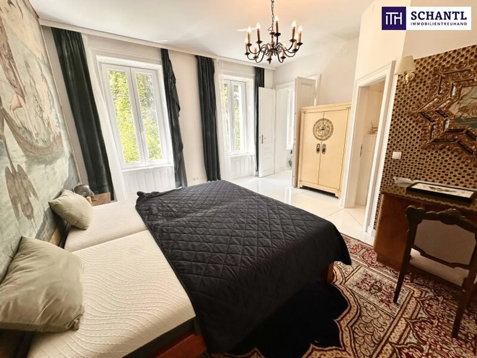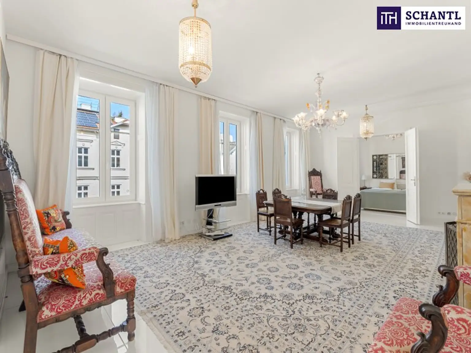 Bereits beim Betreten der Wohnung wird der besondere Charakter spürbar: kunstvolle Stuckdecken, elegante Kristallluster und hochwertiges Echtholzparkett verleihen den Räumen eine zeitlose, repräsentative Ausstrahlung. Die Wohnung verfügt über insgesamt vier Zimmer, zwei Badezimmer, einen Schrankraum sowie eine separate Küche und bietet damit viel Platz für anspruchsvolles Wohnen auf hohem Niveau.