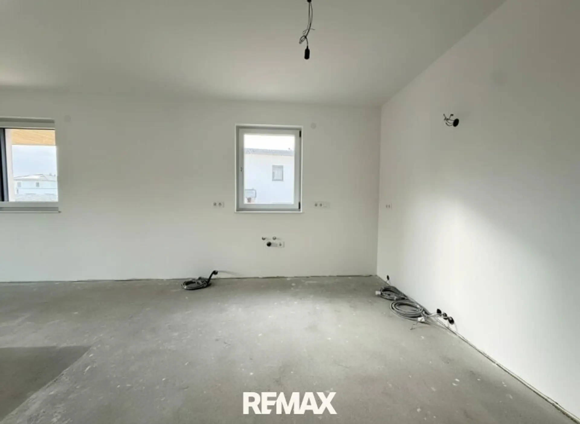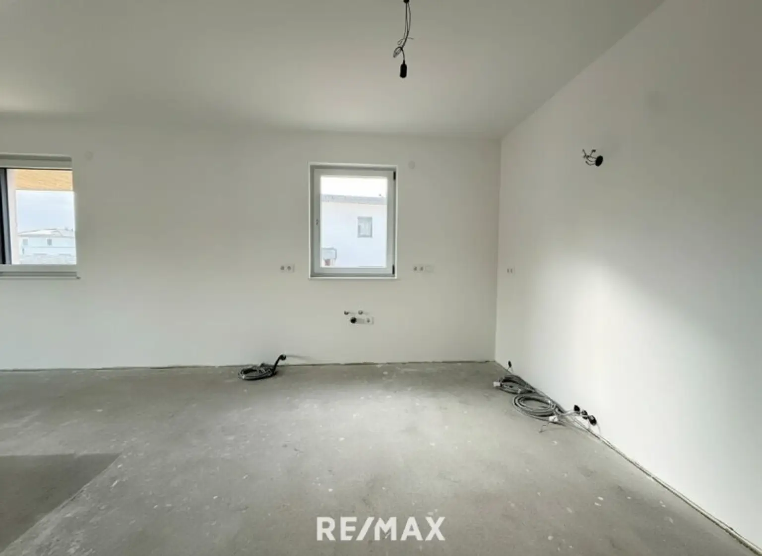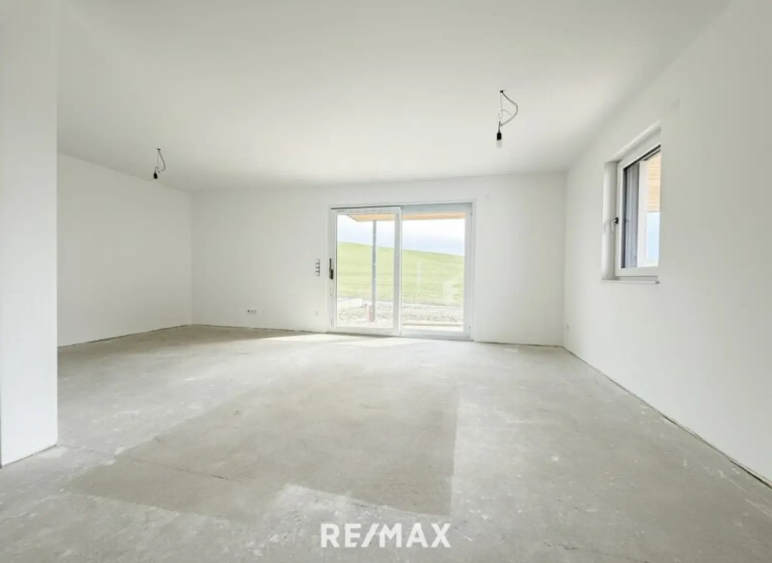 Im Erdgeschoss befinden sich eine Doppelgarage, ein Technikraum mit Zugang nach außen, ein Vorraum, ein WC, ein Abstellraum sowie ein großzügiger Wohn- und Essbereich.