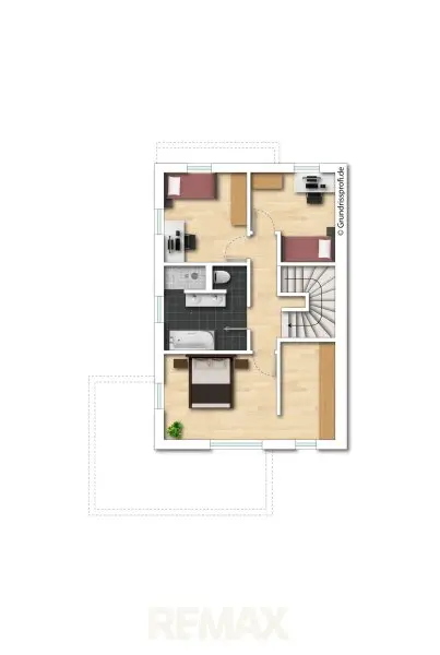Im Obergeschoss stehen drei Schlafzimmer zur Verfügung, eines davon mit Schrankraum, weiters der Flur sowie das Badezimmer mit Dusche und Badewanne.