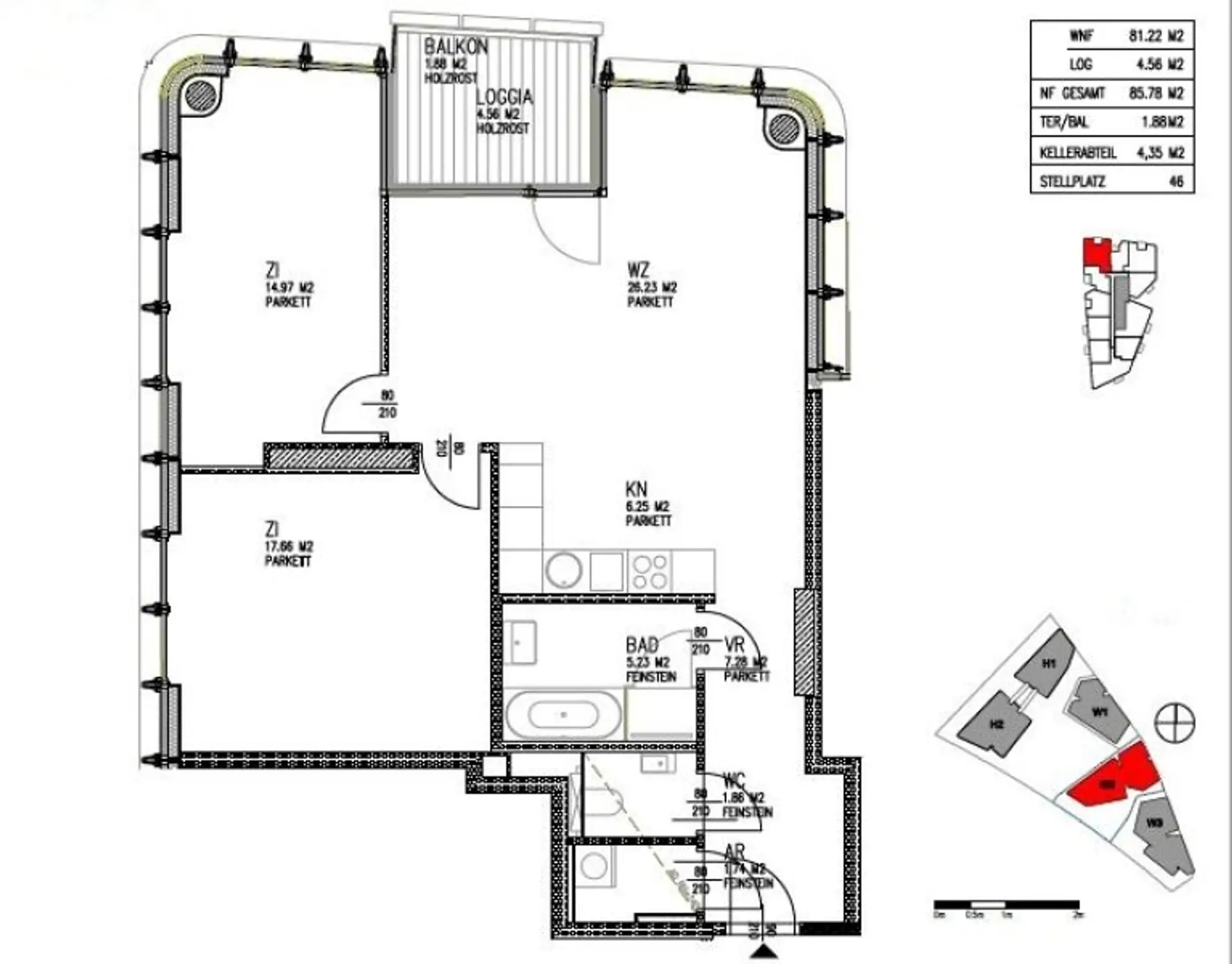Gesamtmiete (inkl. BK, Heiz- und Warmwasserkosten, Kühlung, Lift und Steuern): € 2.356,11