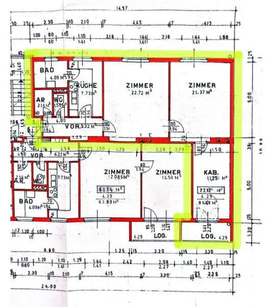 Neben der Küche, dem Bad, der separaten Toilette und einem Abstellraum bietet die Wohnung auf ca. 76 m² Wohnfläche zwei Wohnräume und ein Kabinett. Weiters eine 4,3 m² große, vollverglaste, südostseitig ausgerichtete Loggia. Diese ist über das Kabinett erreichbar.