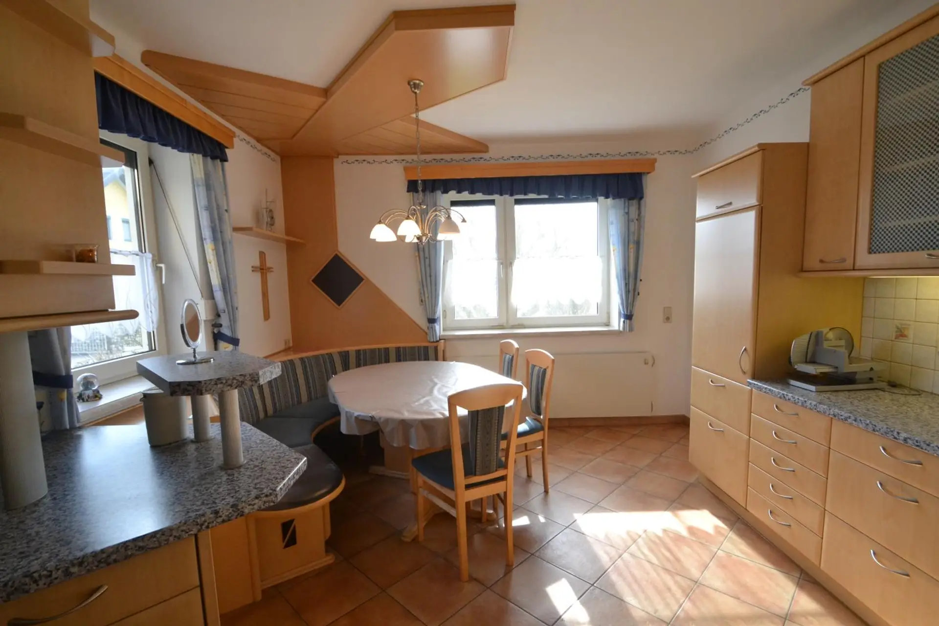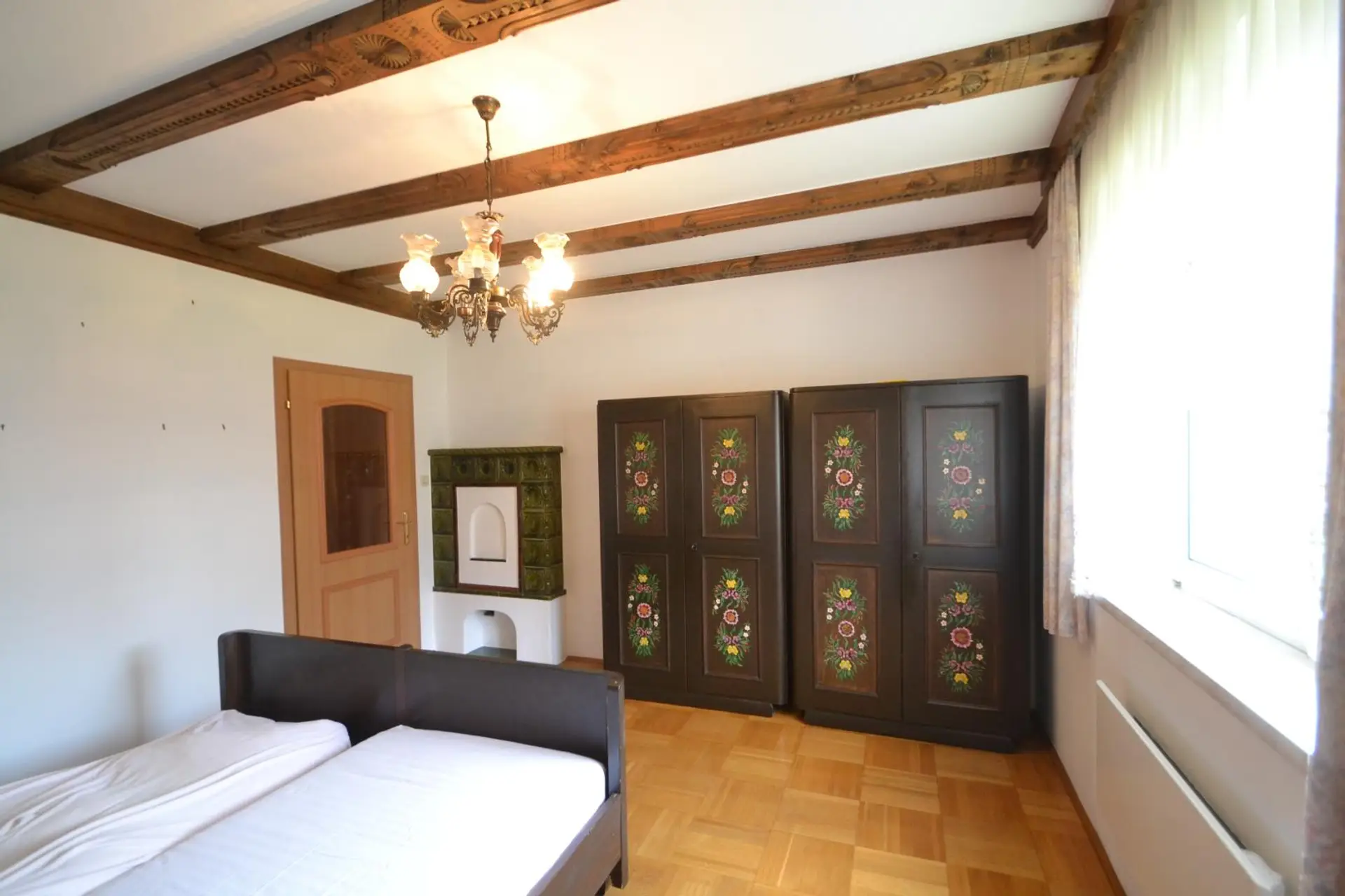 * helle Küche mit gesetztem Holzofen, verbunden mit schönem Kachelofen – bis 4 Räume heizbar