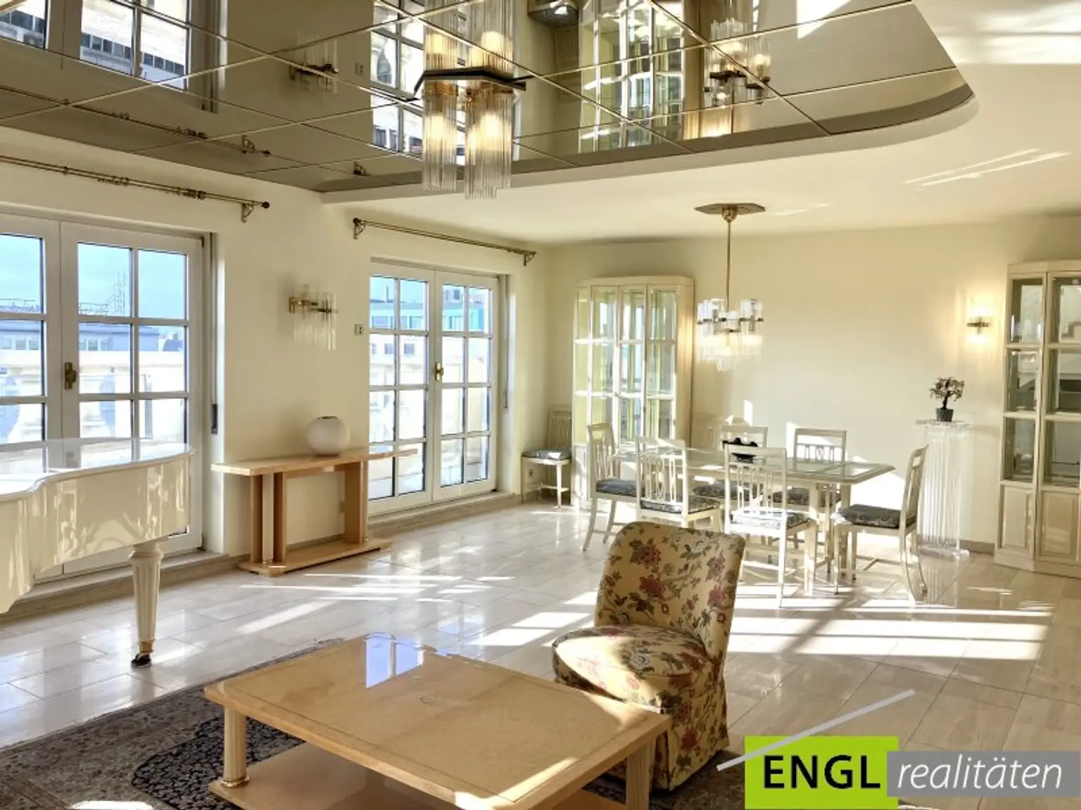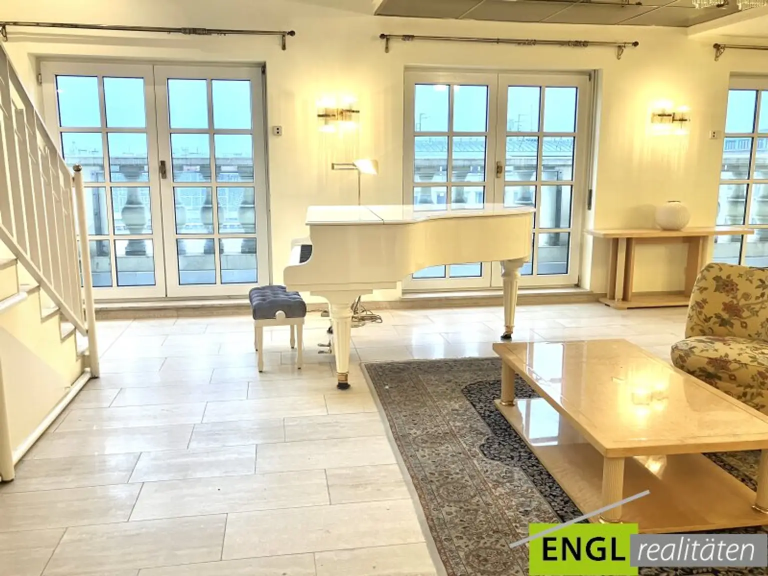 - Großes Wohnzimmer inklusive weißem Klavier von Schimmel (kann auf Wunsch entfernt werden), Esstisch für 6-8 Personen, 3 Ausgänge auf den Balkon mit Blick Richtung Südwesten und Karlskirche, Klimagerät