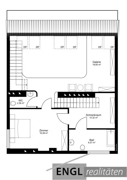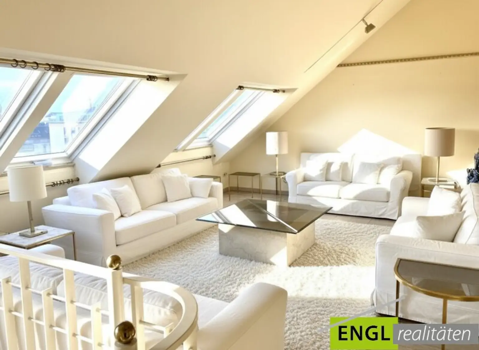 - Treppe in die offene Galerie, Loungebereich und Bücherregale ideal als 2. Wohnzimmer oder Bibliothek, mit Dachfenster (Blick Richtung Karlskirche) Klimagerät und Dachfenster mit Außenjalousie