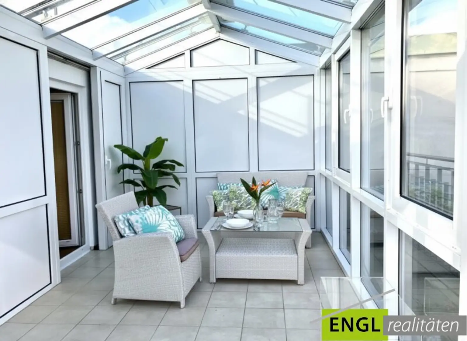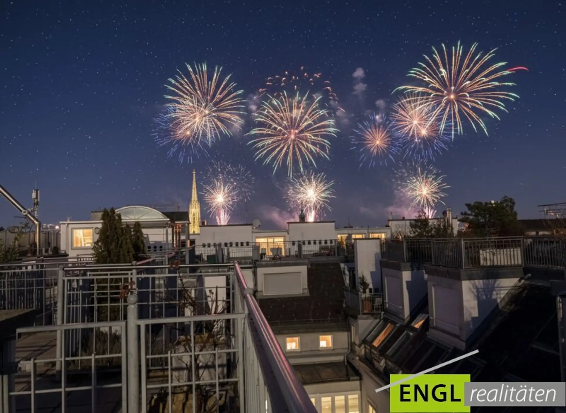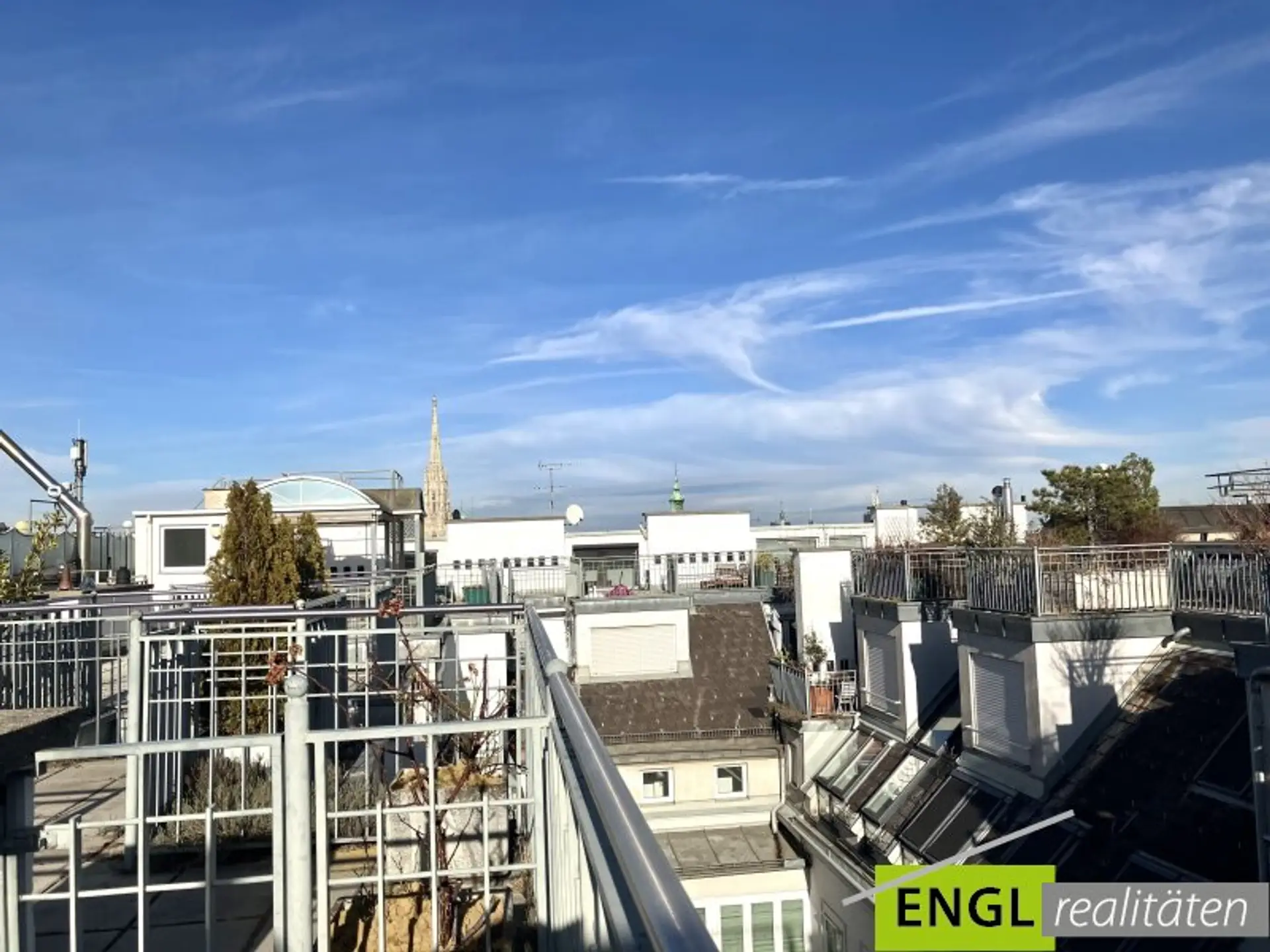 - Aufgang in den Wintergarten mit Außenjalousien und Blick Richtung Stephansdom