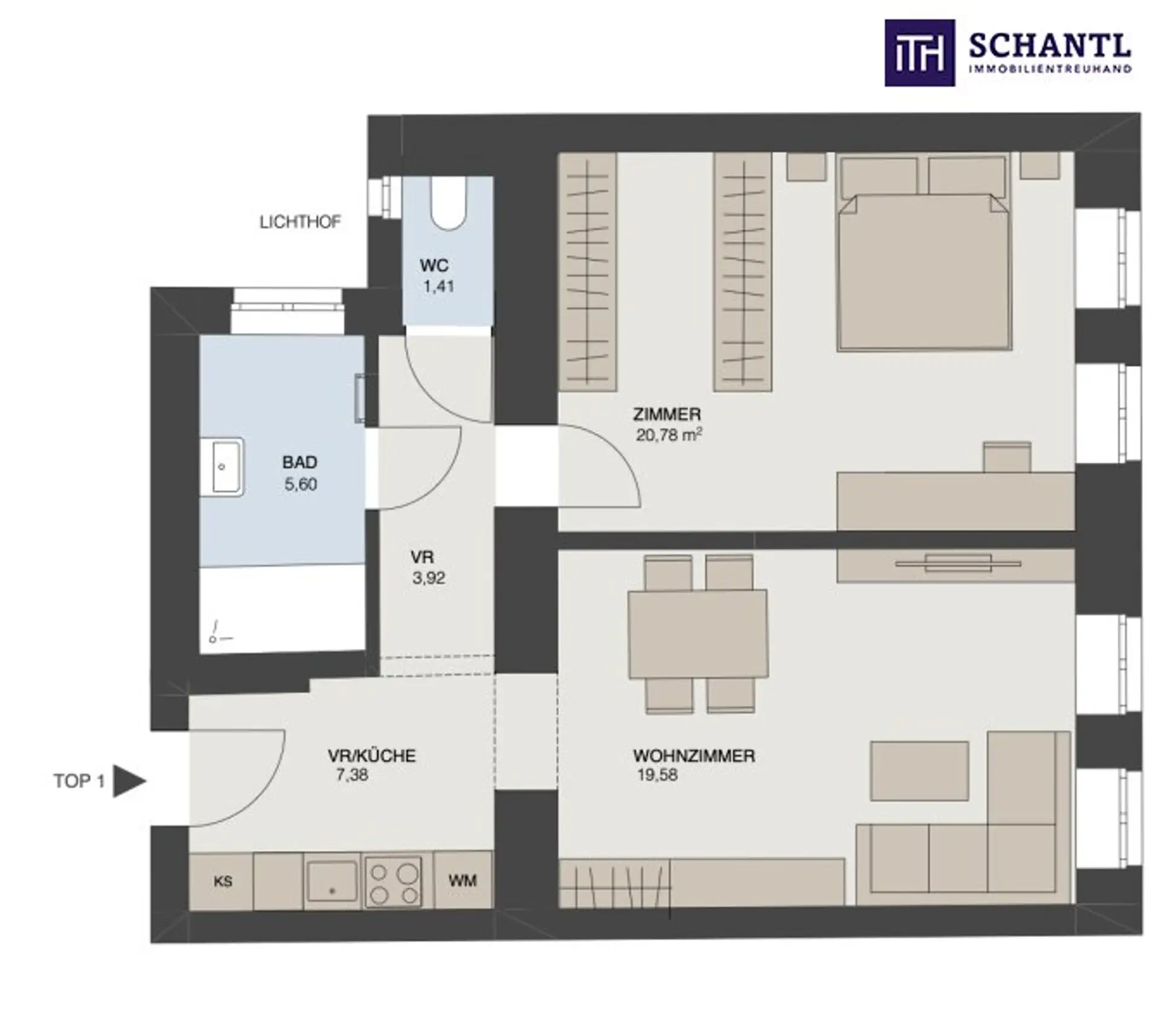 TOP 1 - Stilvolle 2-Zimmer-Wohnung (Büro) mit optimaler Raumaufteilung.
