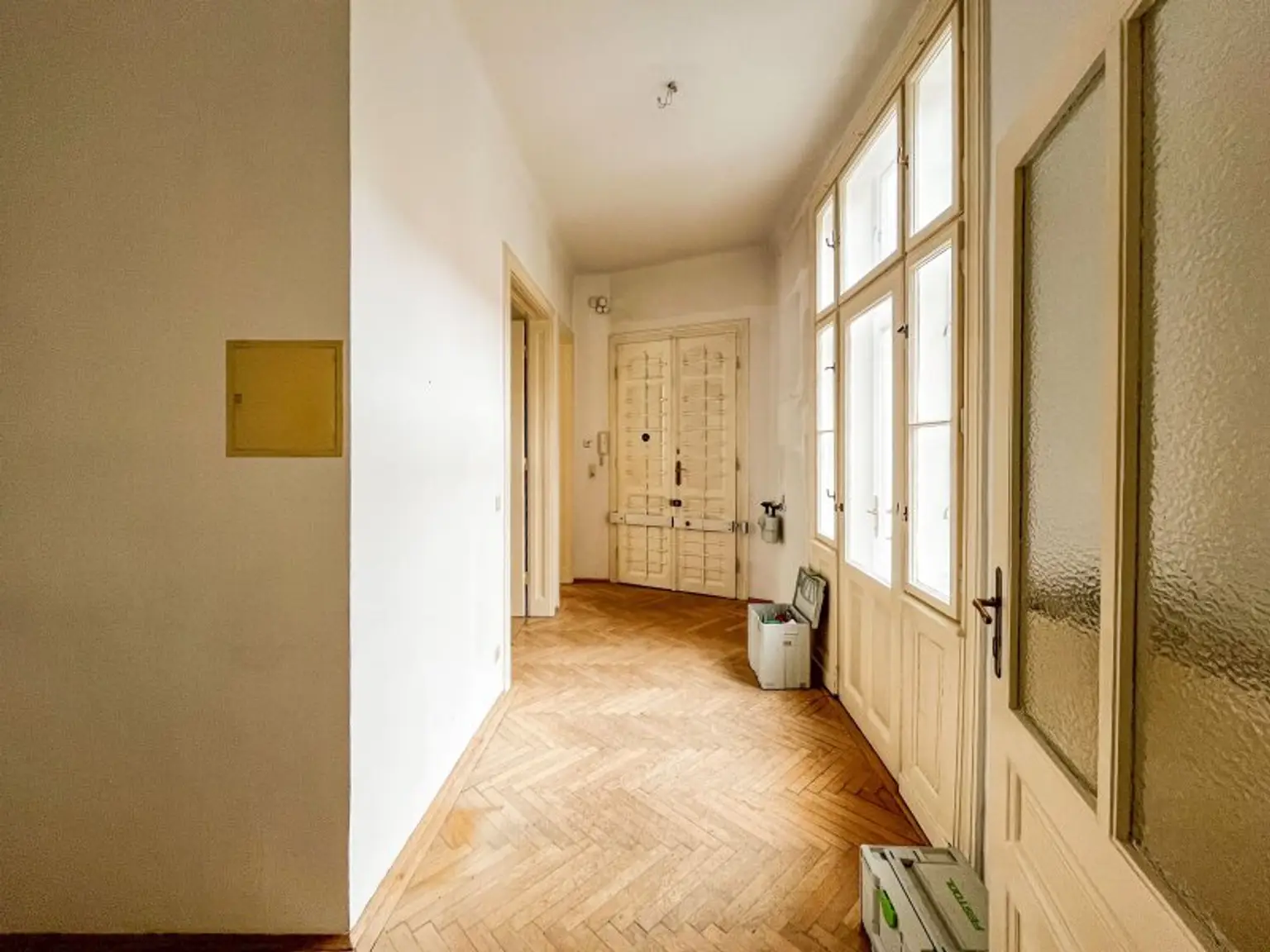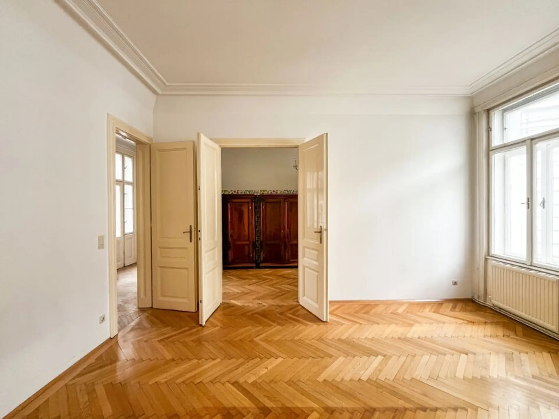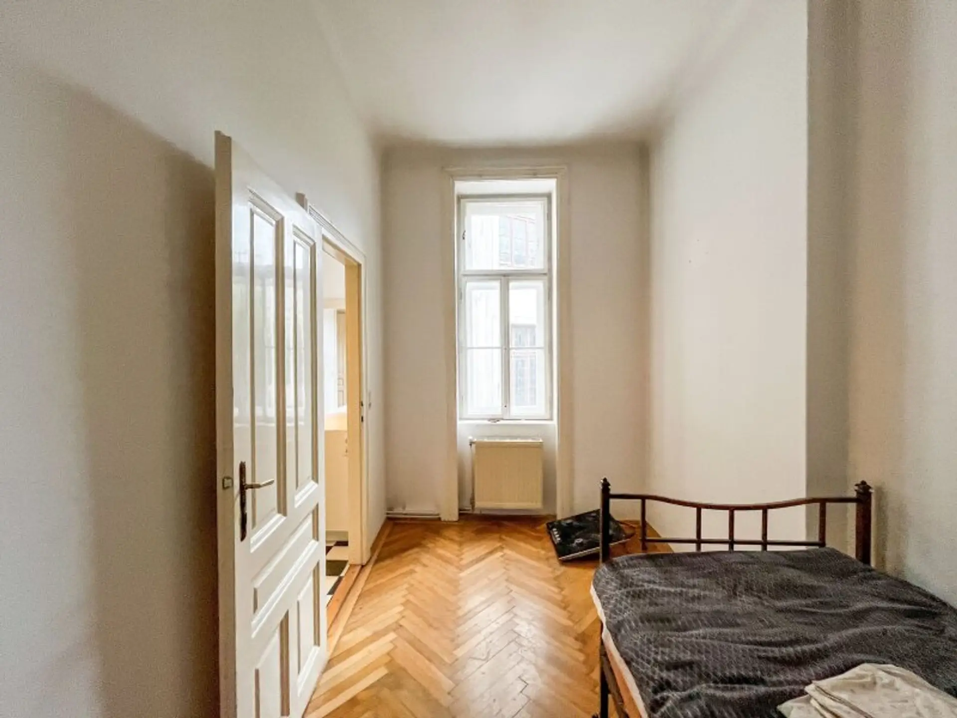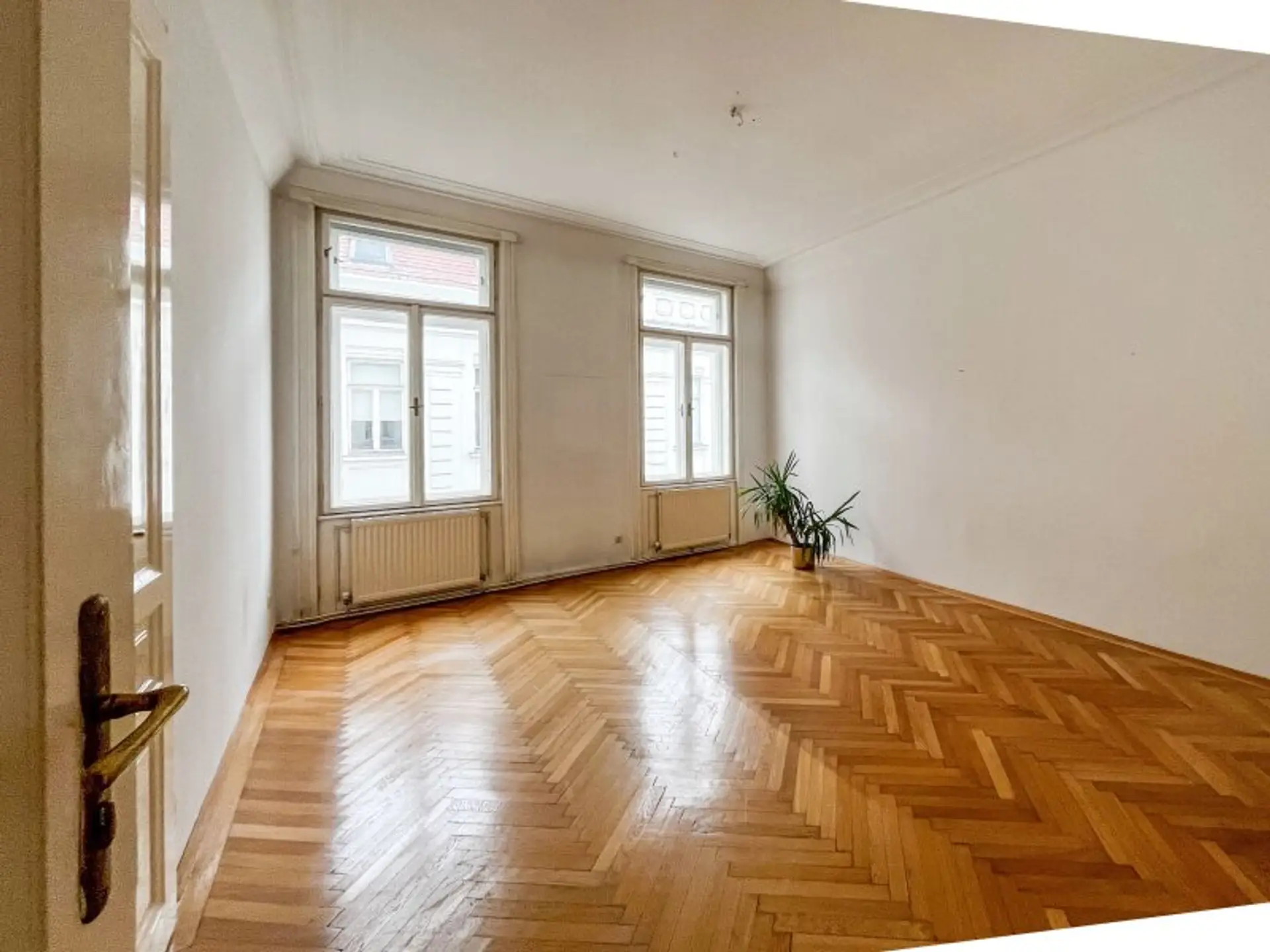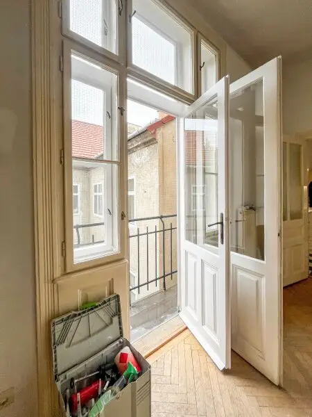 Die Wohnung besteht aus zwei großen Altbauzimmern (ca. 25,59 m² u. ca. 22,46 m²), einem mittelgroßen Zimmer (ca. 13,52 m²), einem so genannten Kabinett (ca. 8,77 m²), einer Küche mit Speis, einem Bad und einem separaten WC. Weiters hat die Wohnung einen kleinen (1 m²), südseitigen Balkon. Die Zimmer sind unabhängig voneinander zu begehen. Die Wohnung ist in einem guten Zustand.