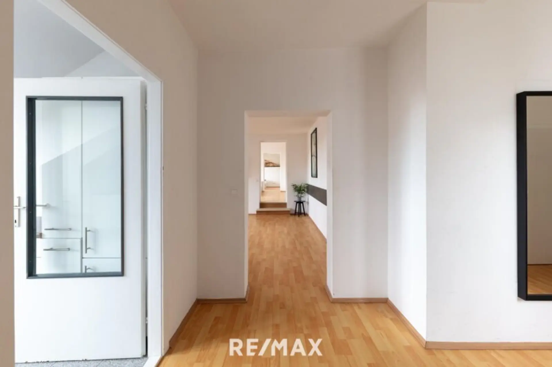 Die charakteristischen Elemente der Jahrhundertwende-Architektur – hohe Räume, Fischgrätparkett, Flügeltüren – sind teilweise erhalten und unterstreichen den einzigartigen Stil des Hauses.