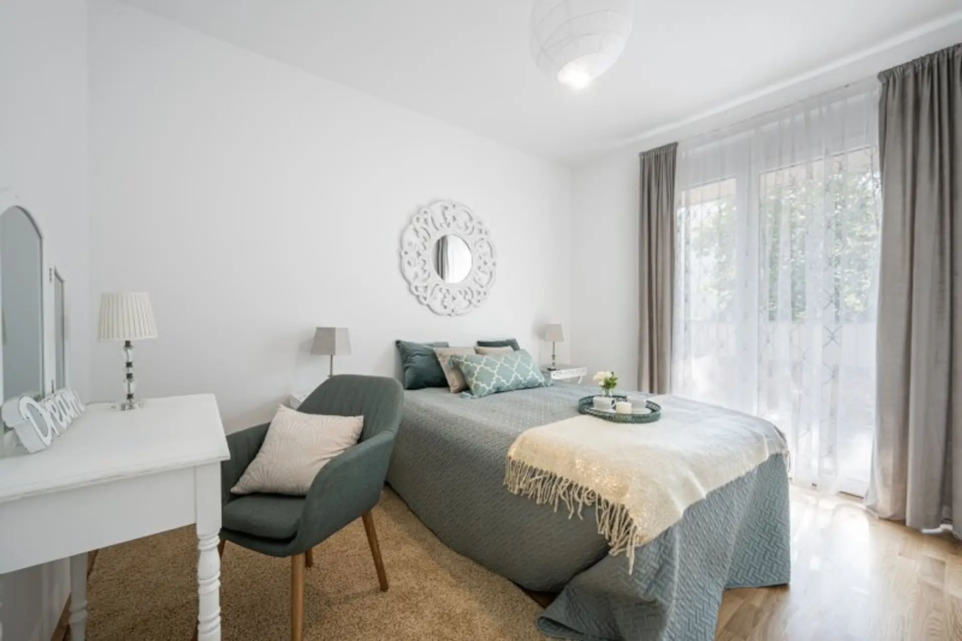 * Wohnbereich und Schlafzimmer sind mit einem Eiche Fertigparkettboden mit Trittschalldämmung ausgestattet