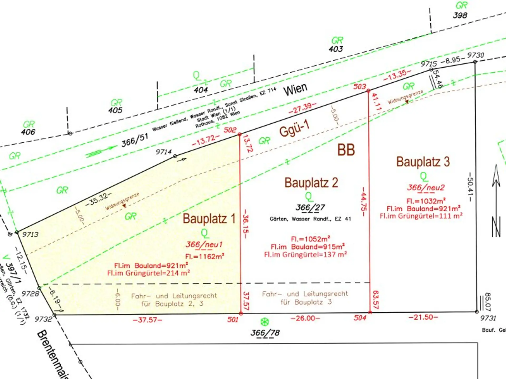Bauplatz 1 kann über eine neu zu errichtende Zufahrt an der Brentenmaisstraße befahren werden, die Zufahrt zu den dahinterliegenden Teilflächen wird über Fahr- und Leitungsrechte geregelt.