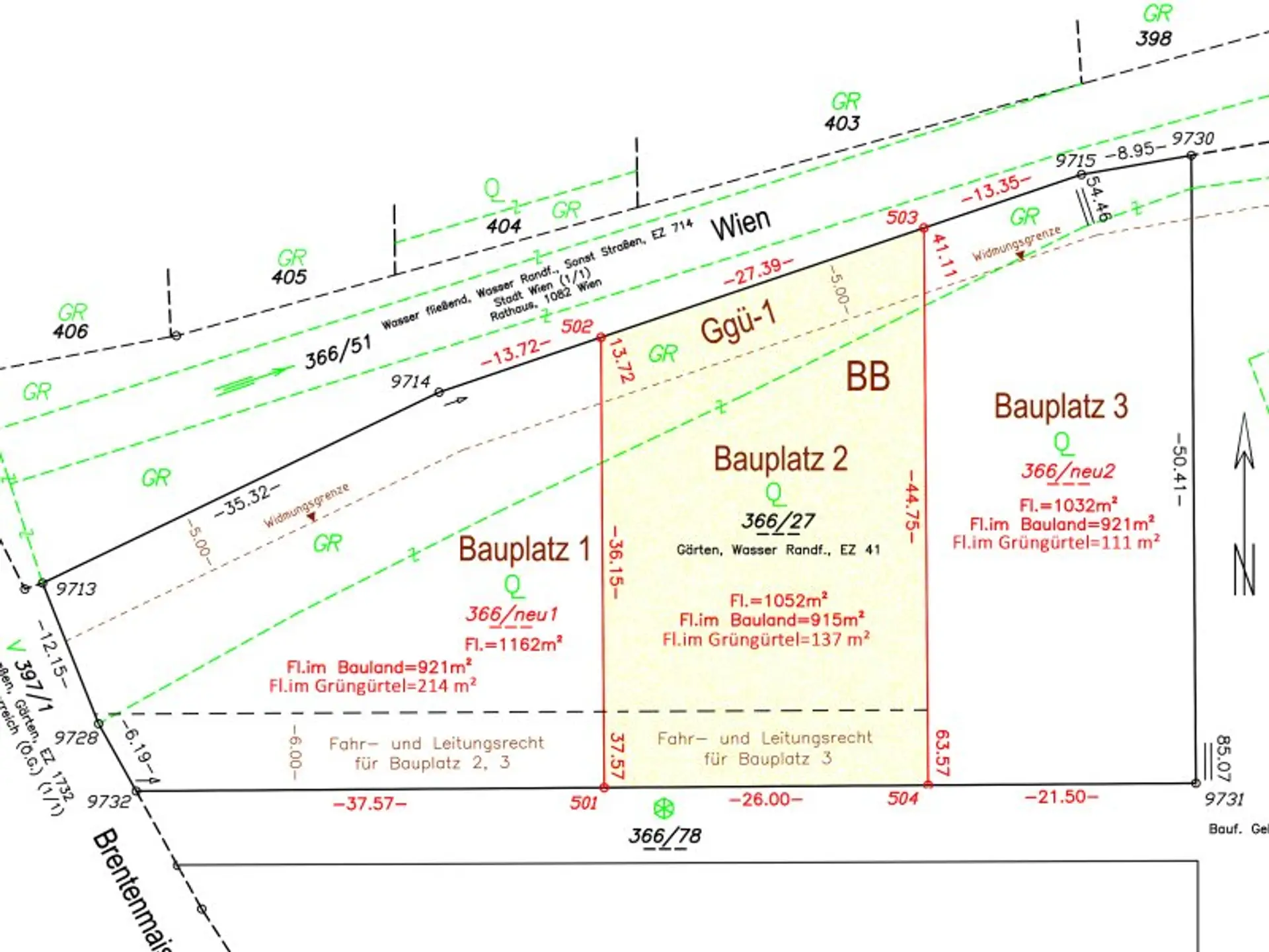 Bauplatz 1 kann über eine neu zu errichtende Zufahrt an der Brentenmaisstraße befahren werden, die Zufahrt zu den dahinterliegenden Teilflächen wird über ein Fahr- und Leitungsrecht geregelt.