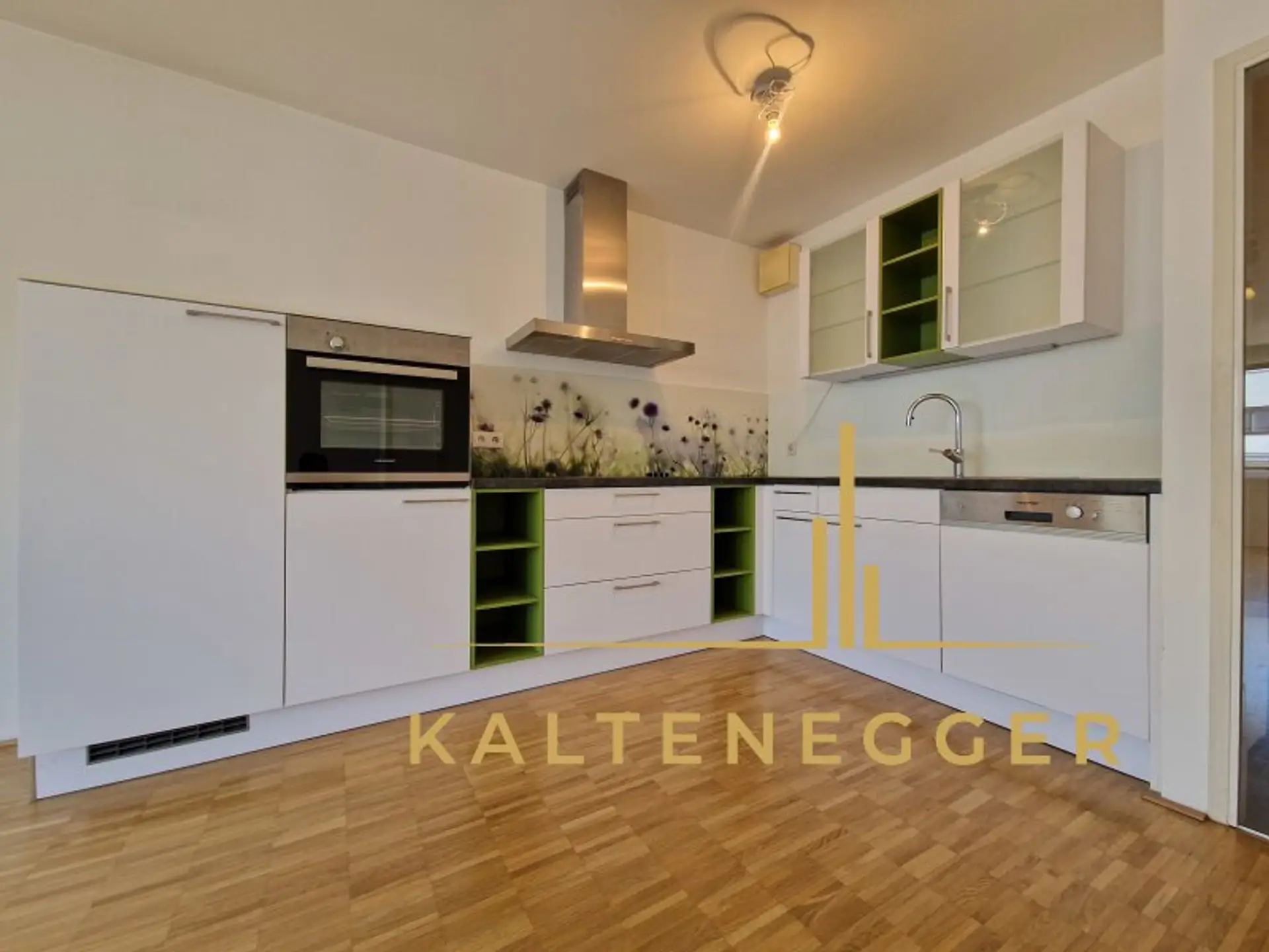 Die moderne Küche ist mit einem Spülbecken, einem Geschirrspüler, einem Kühlschrank, einem Backrohr, einem Elektrokochfeld, sowie einer Umluft ausgestattet.