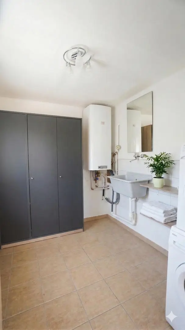 Das Haus verfügt über eine effiziente Stromheizung, die nachhaltig und kostengünstig über eine Energiegemeinschaft mit dem Nachbarn versorgt wird.