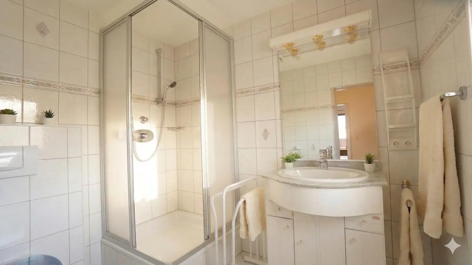 - Frisch modernisiert: Das Gäste-WC im Erdgeschoss wurde komplett neu gefliest und modern ausgestattet.