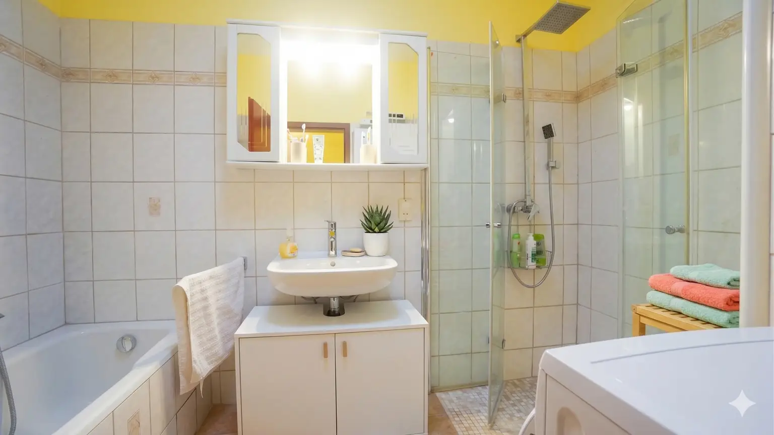 - Bad 5,50 m², hier haben wir Waschbecken, Dusche, Badewanne und Waschmaschinenanschluss.