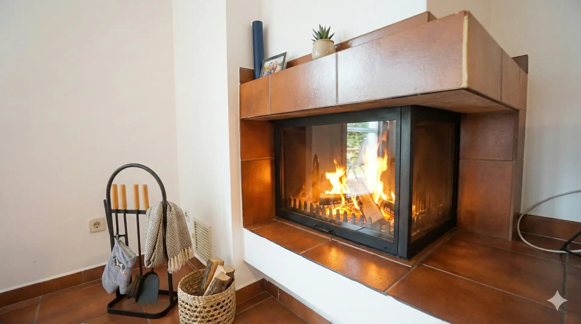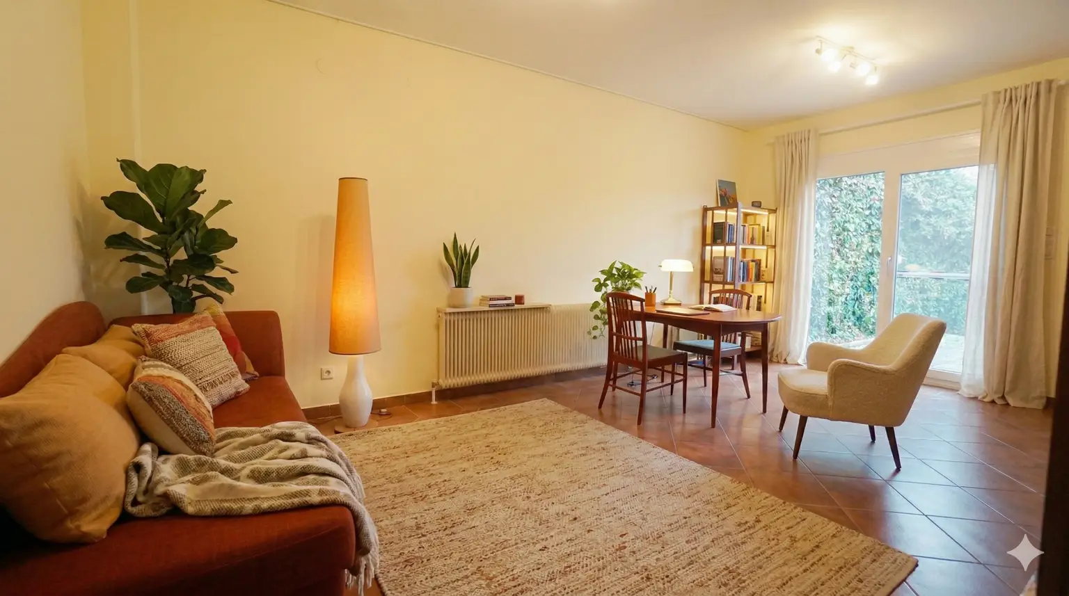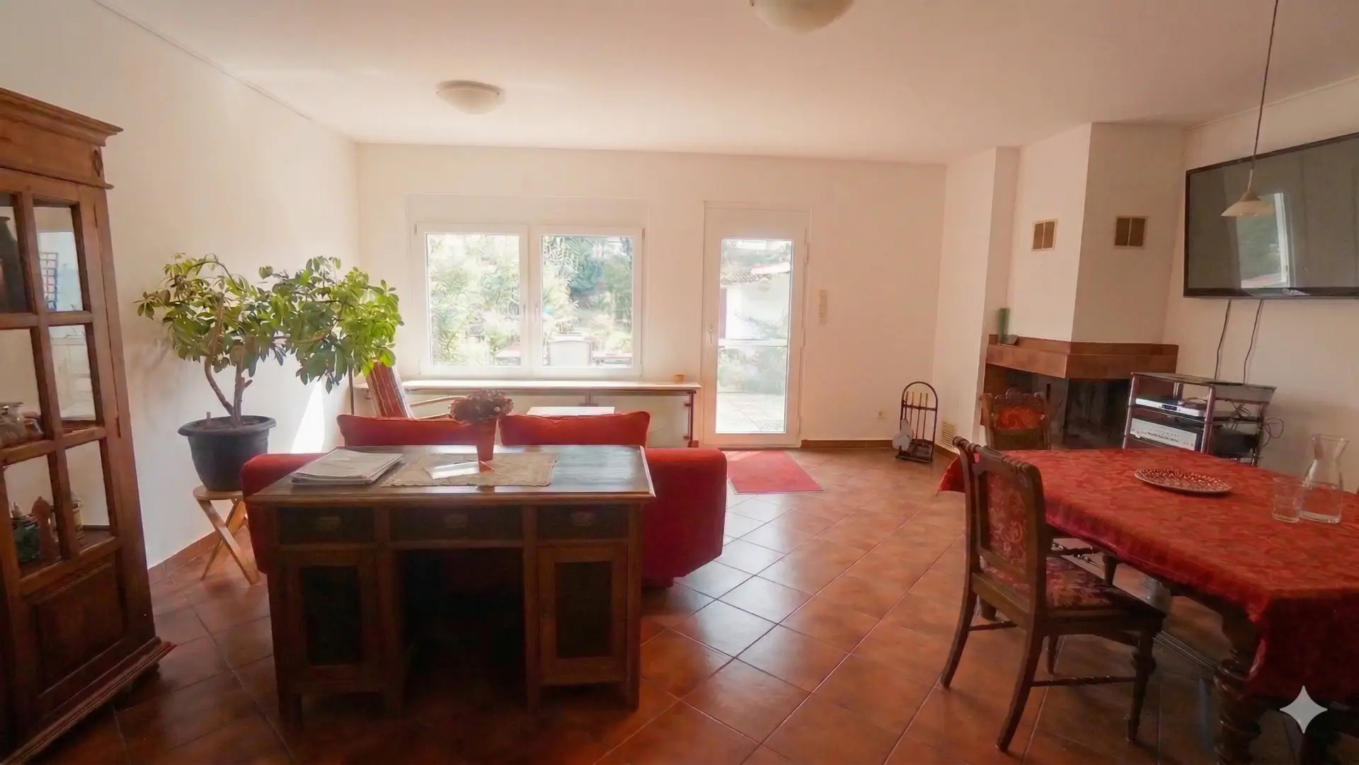 - Wohnzimmer 35,26 m², ausgestattet mit einem Kamin und einem weiteren Zugang auf die Terrasse und anschließender grüner Oase.