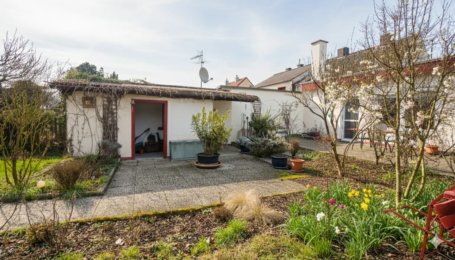 DER GARTEN hat ca. 350m² und wurde mit Wegen, kleinen Rückzugsorten und einem Schuppen entzückend gestaltet.