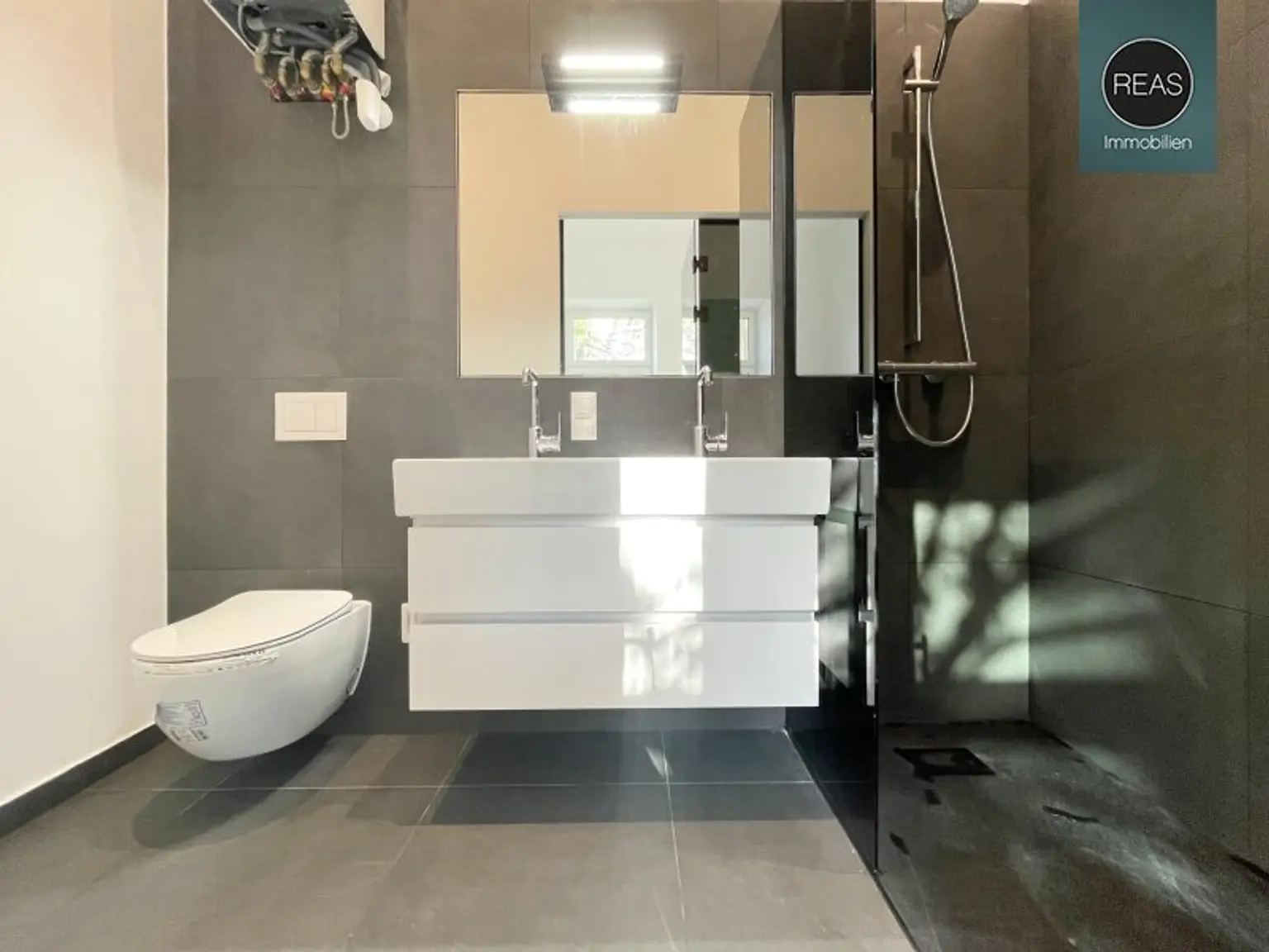 * 1 Bad mit WC, Dusche mit Glaswand, Doppelwaschbecken samt Unterschrank und Spiegel
