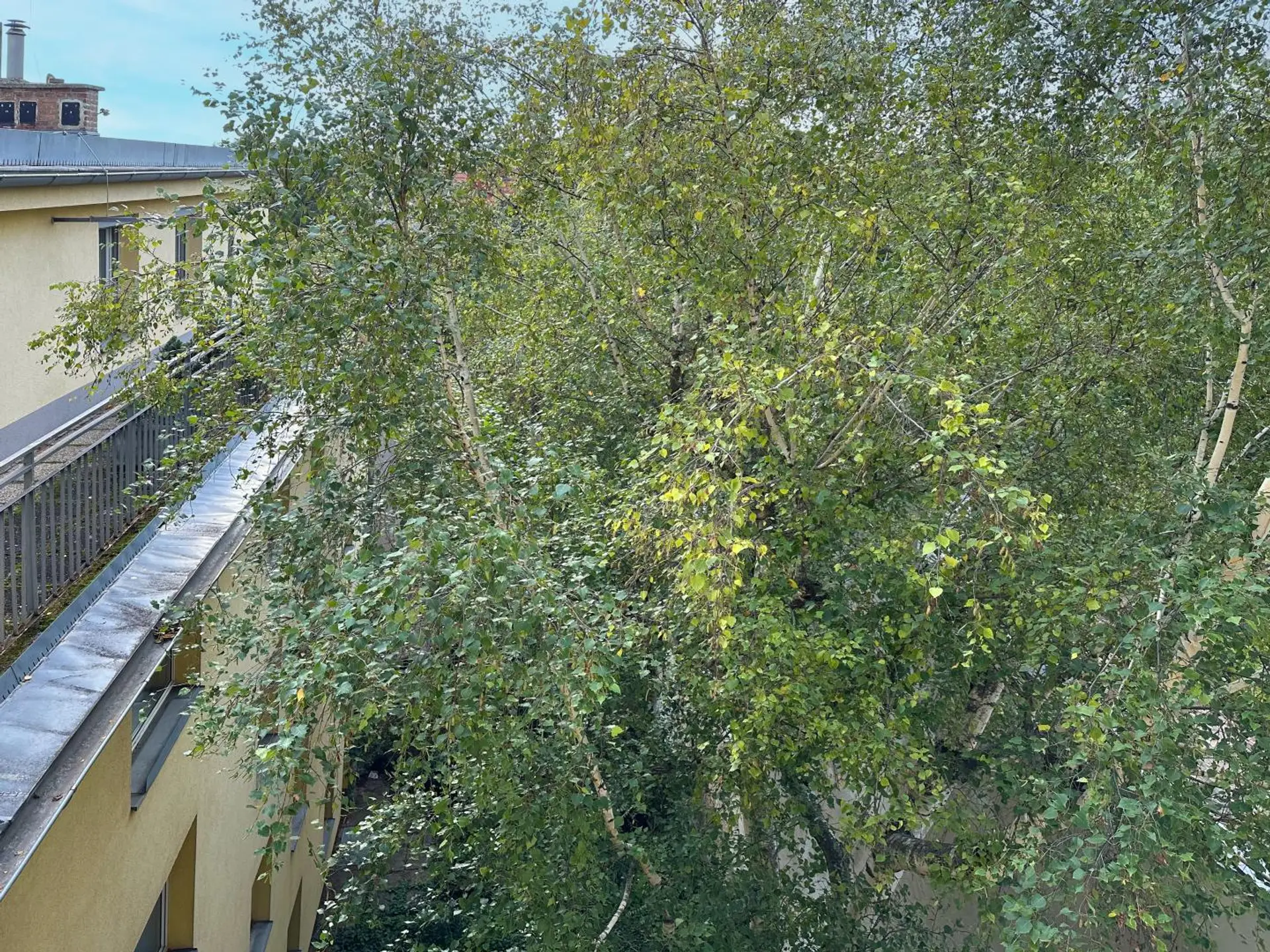 Vor den Fenstern haben Sie Bäume, angenehm gute Luft und Grün. Sie schauen also NICHT auf die Straße, sondern in den Innenhof bzw. Gemeinschaftsgarten.