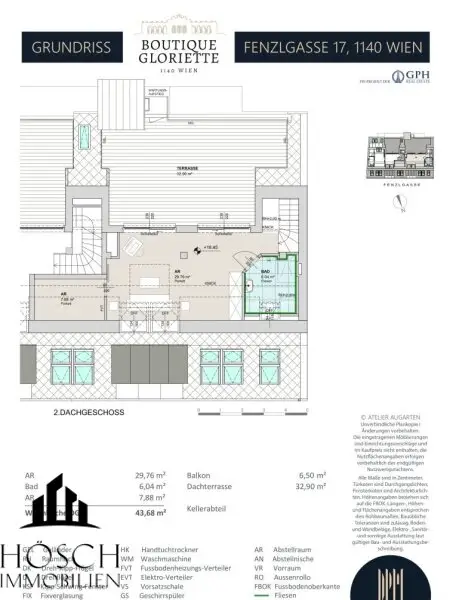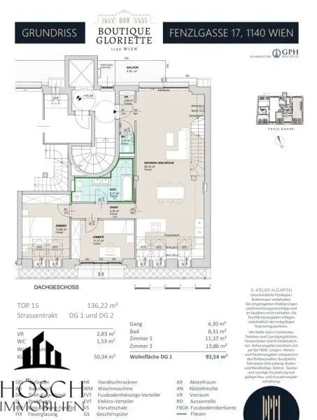 Die Dachgeschoss-Maisonette Top 15 erstreckt sich über zwei Ebenen und verfügt über eine Wohnfläche von ca. 136,22 m². Die durchdachte Raumaufteilung sowie die attraktiven Außenflächen machen diese Einheit zu einer idealen Kombination aus Stadtresidenz und hochwertigem Familienwohnsitz.