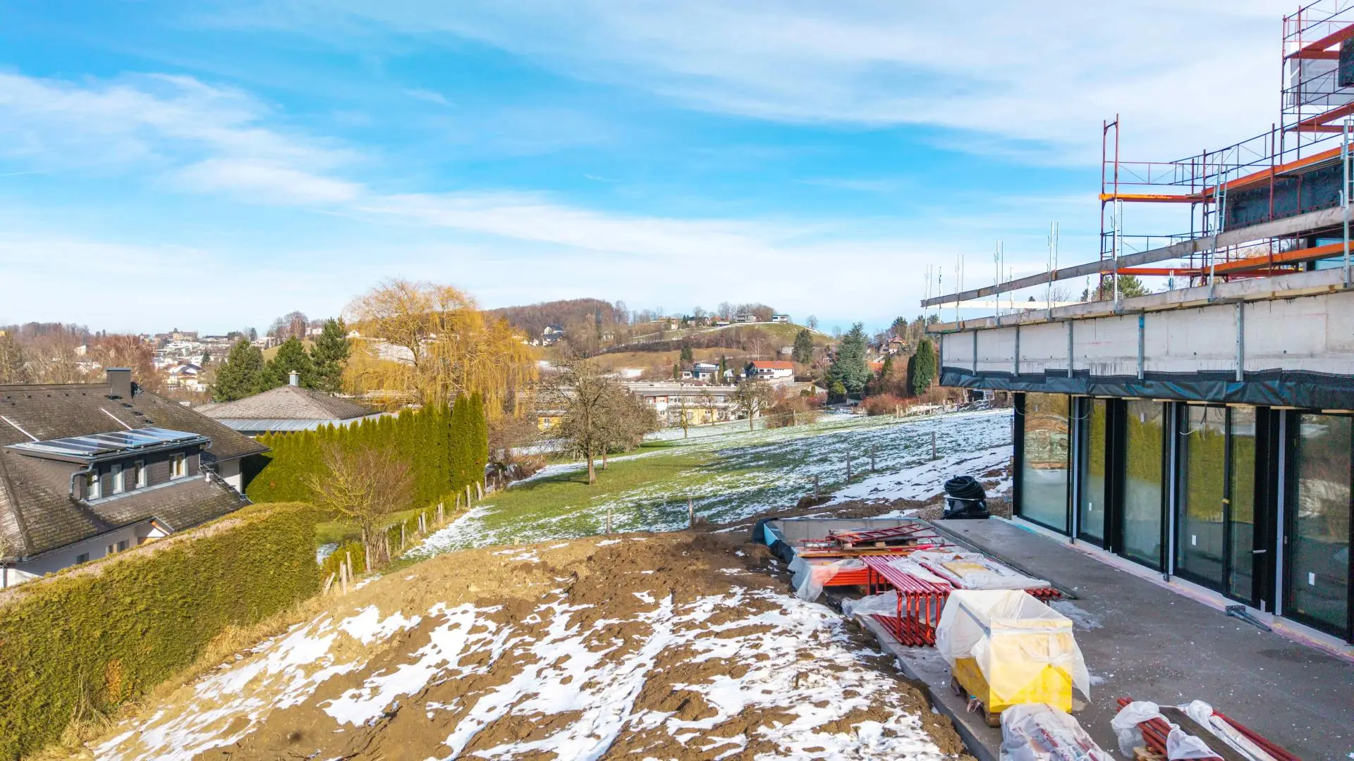 Rendering vom Gartengeschoss Baufortschritt Baufortschritt Hausansicht Baufortschritt Rendering von vorne Rendering von der Zufahrt-Seite Rendering Rendering Plan zur Wohnung Top 6