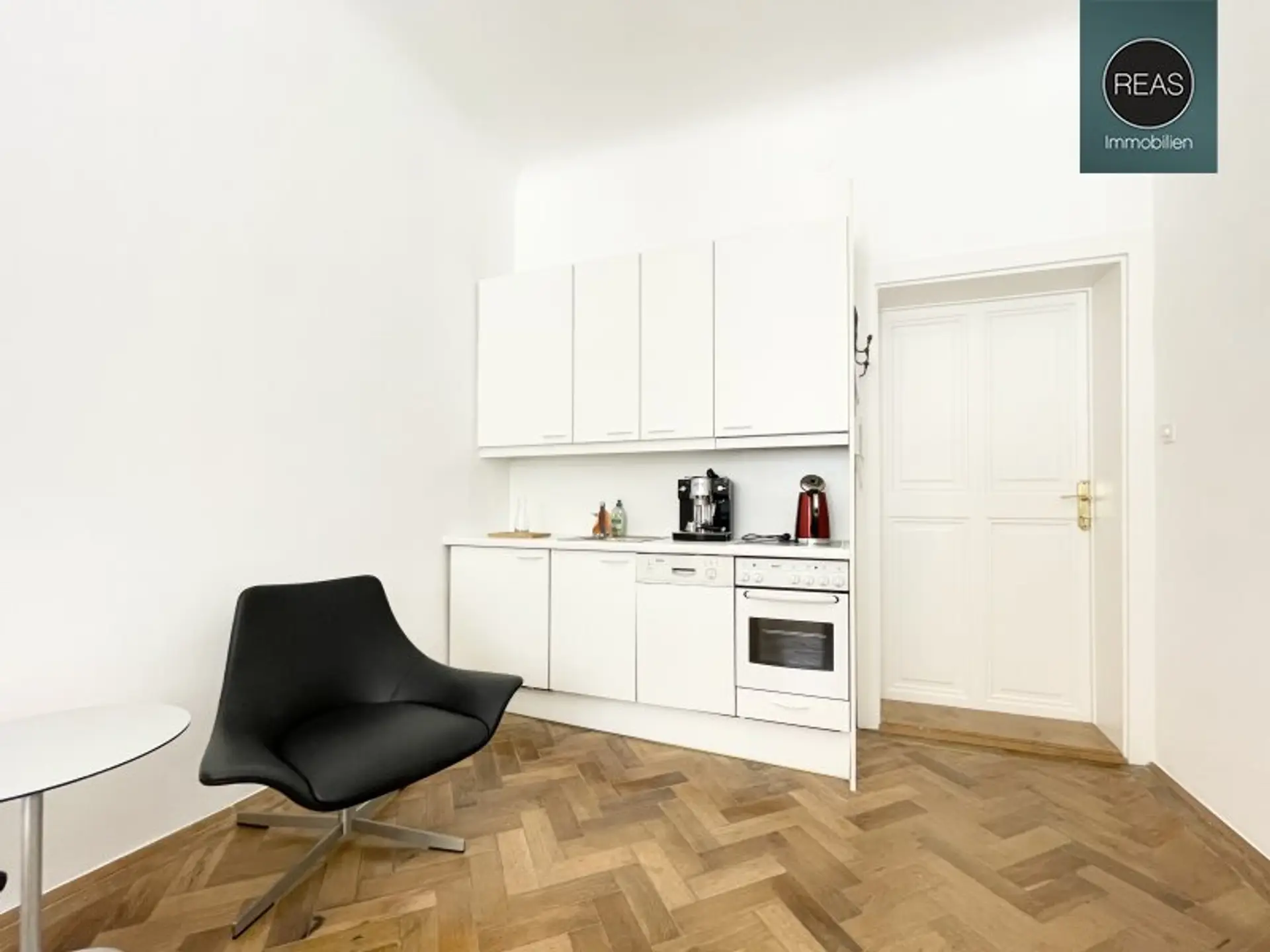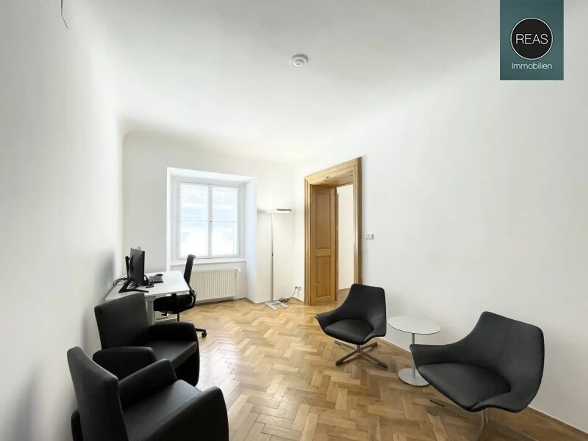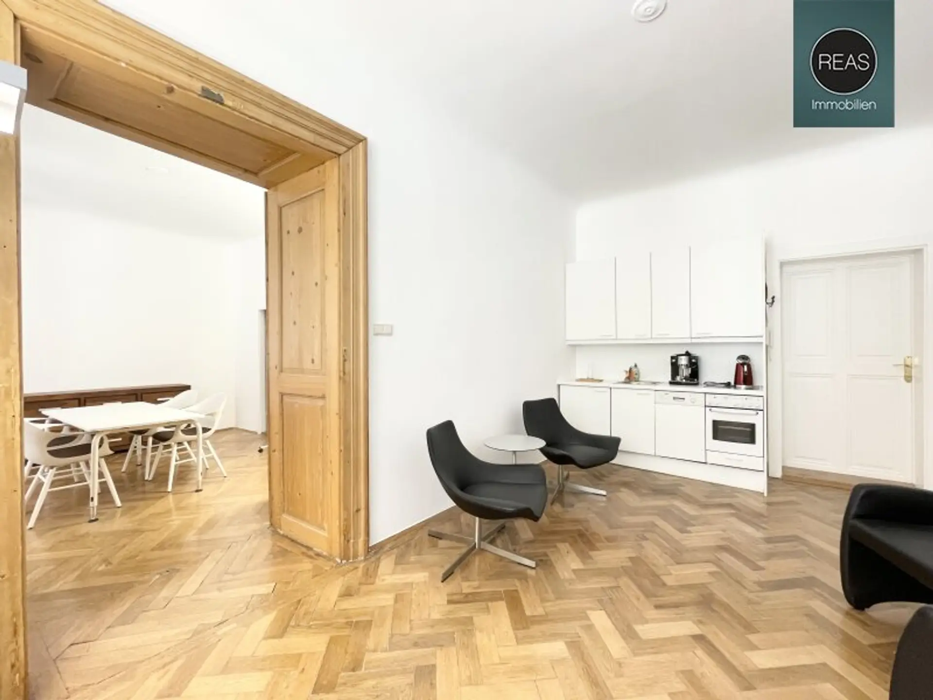 Das Büro ist über 2 repräsentative Hauseingänge (1x mit Lift) erreichbar. Zur hochwertigen Ausstattung gehören Echtholz Parkettböden, eine voll ausgestattete Einbauküche sowie Flügeltüren.
